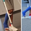 This young boy (about 13-15 years old) has a foot injury. His right lower leg is fixed with a plaster of paris splint wrapped with a blue bandage and equipped with a beautiful toeplate.