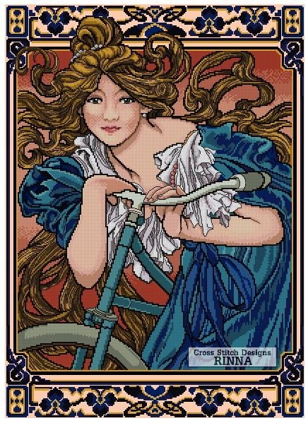 Lady With a Bicycle Blue Art Nouveau Design Cross Stitch Pattern