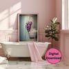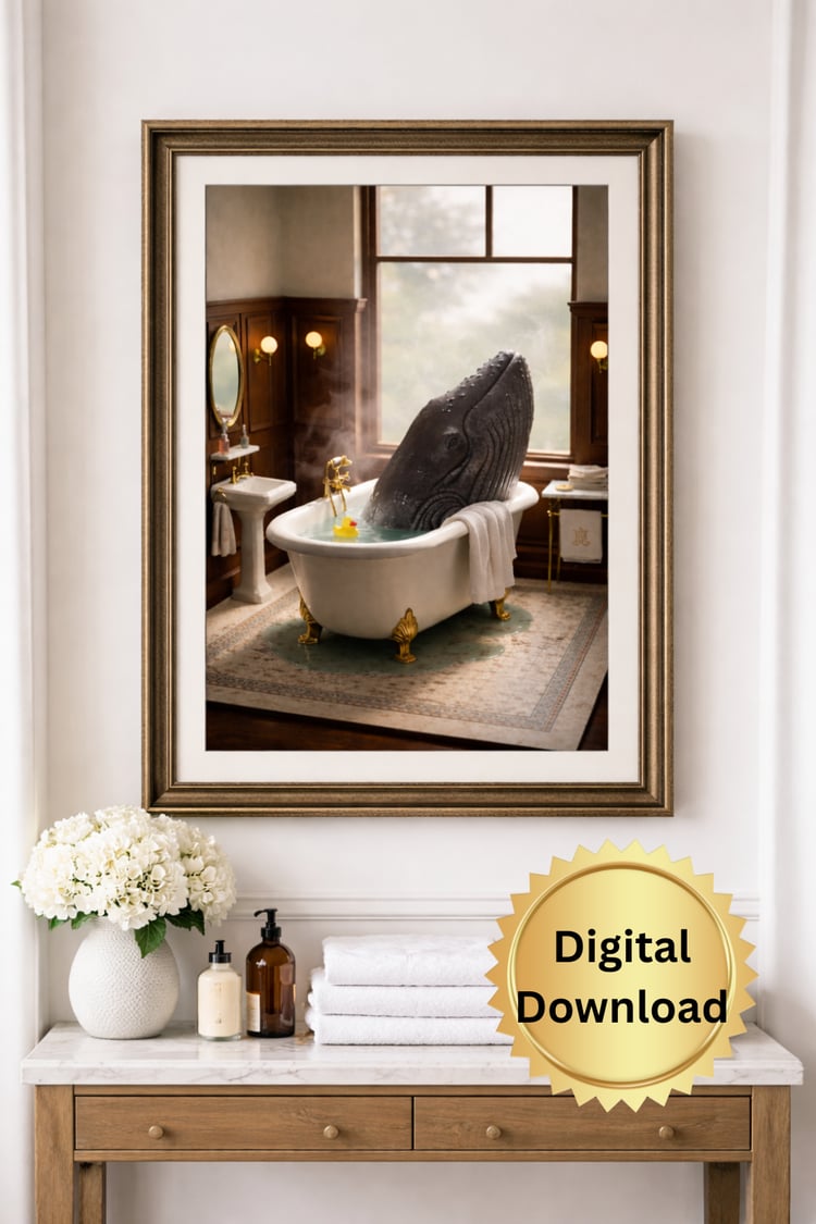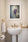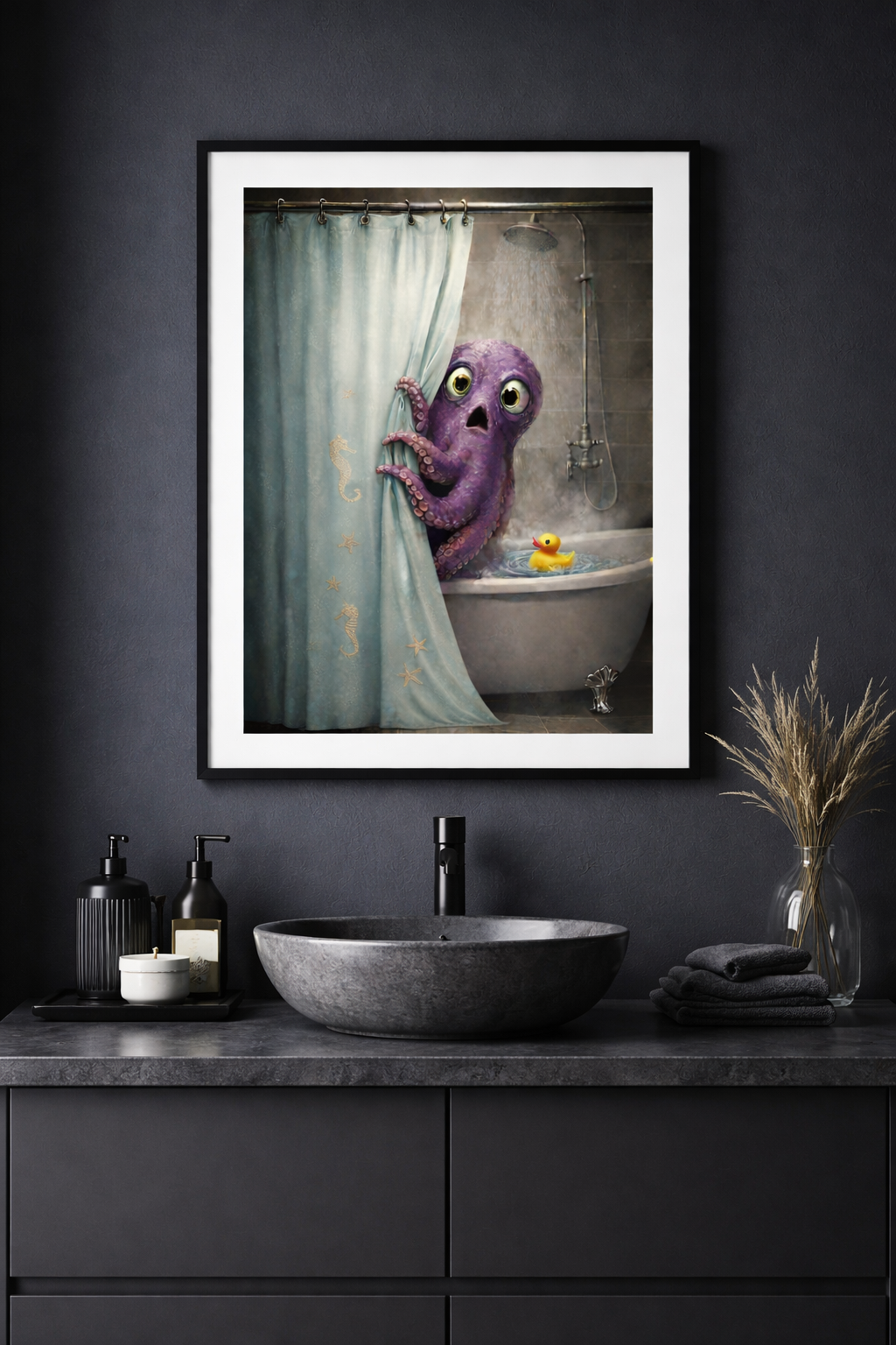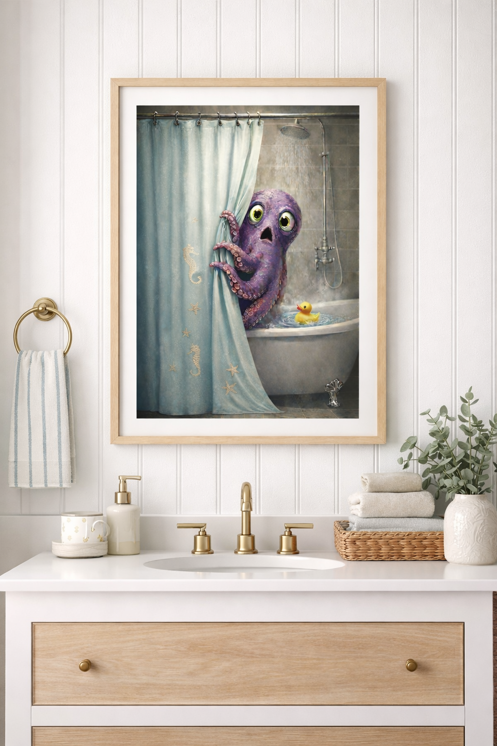 'Occupied' features a wide-eyed octopus peeking out from behind the shower curtain, clearly startled โ but whether itโs the hot water or the unexpected rubber duck is up for debate. This whimsical coastal print blends humor with an elevated, spa-inspired aesthetic, making it a standout piece for bathrooms that deserve a little personality.