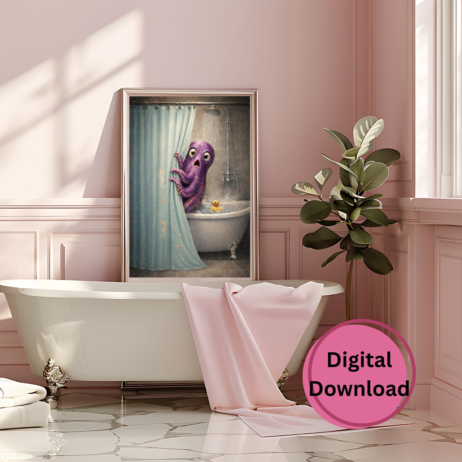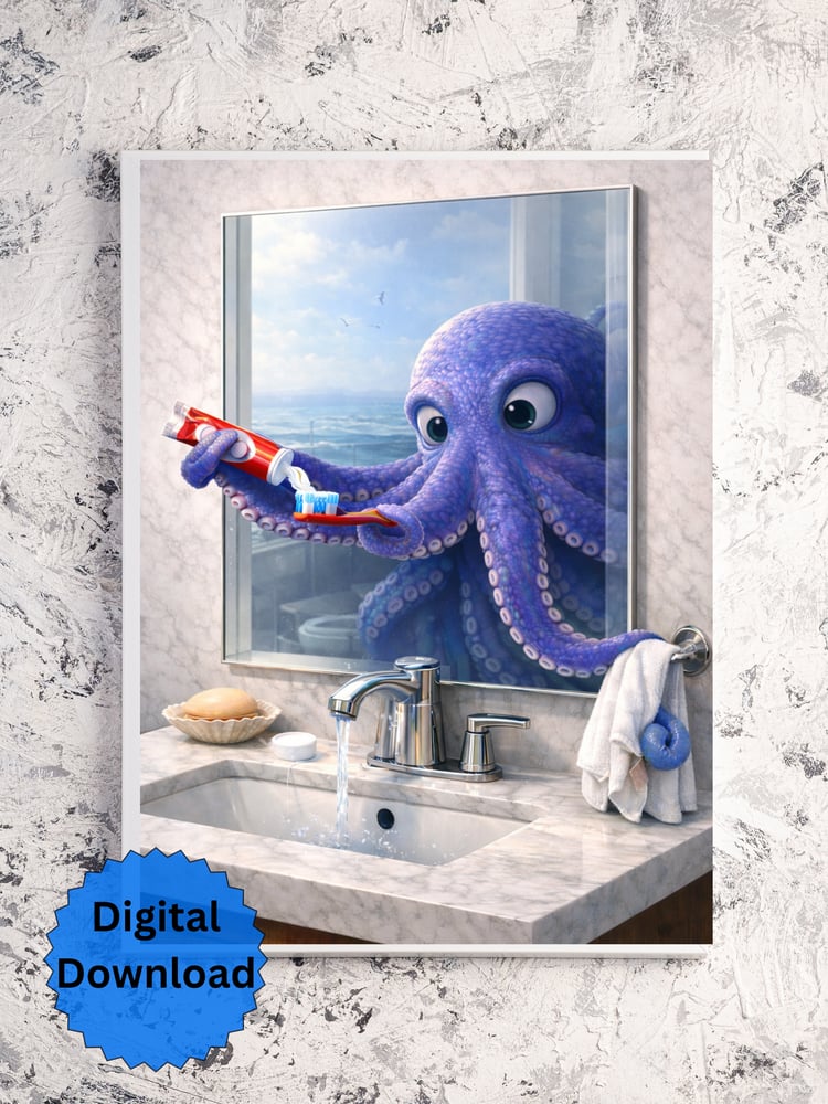 Funny Bathroom Wall Art, Octopus Shower Print, Coastal Restroom Decor, Whimsical Ocean Art