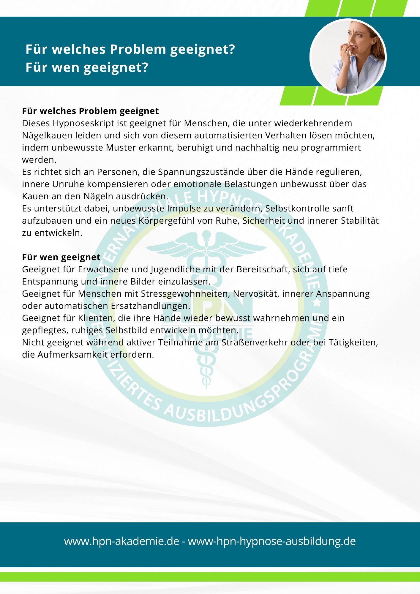 Es richtet sich an Personen, die Spannungszustände über die Hände regulieren, innere Unruhe kompensieren oder emotionale Belastungen unbewusst über das Kauen an den Nägeln ausdrücken.