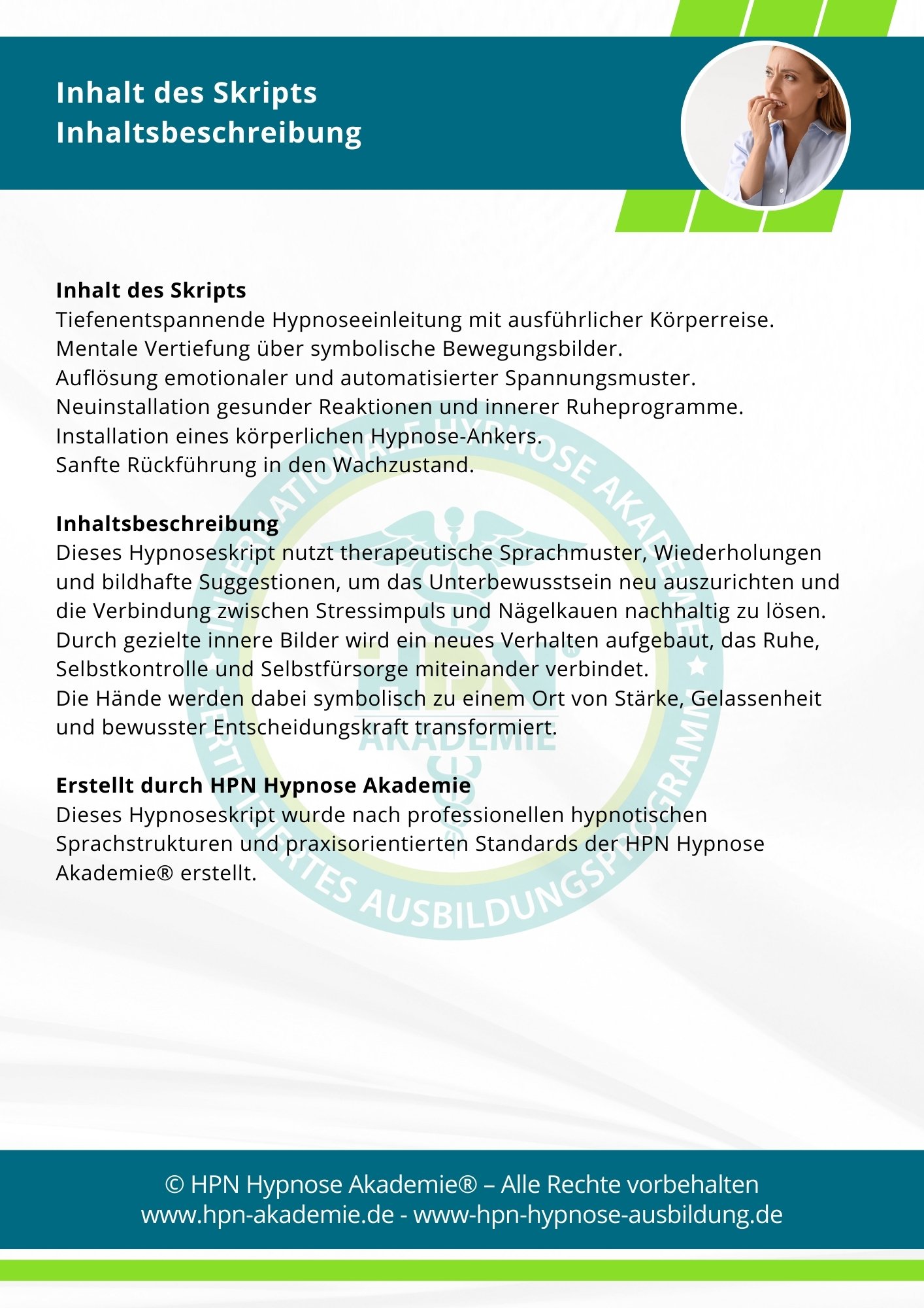 Dieses Hypnoseskript ist geeignet für Menschen, die unter wiederkehrendem Nägelkauen leiden und sich von diesem automatisierten Verhalten lösen möchten, indem unbewusste Muster erkannt, beruhigt und nachhaltig neu programmiert werden.