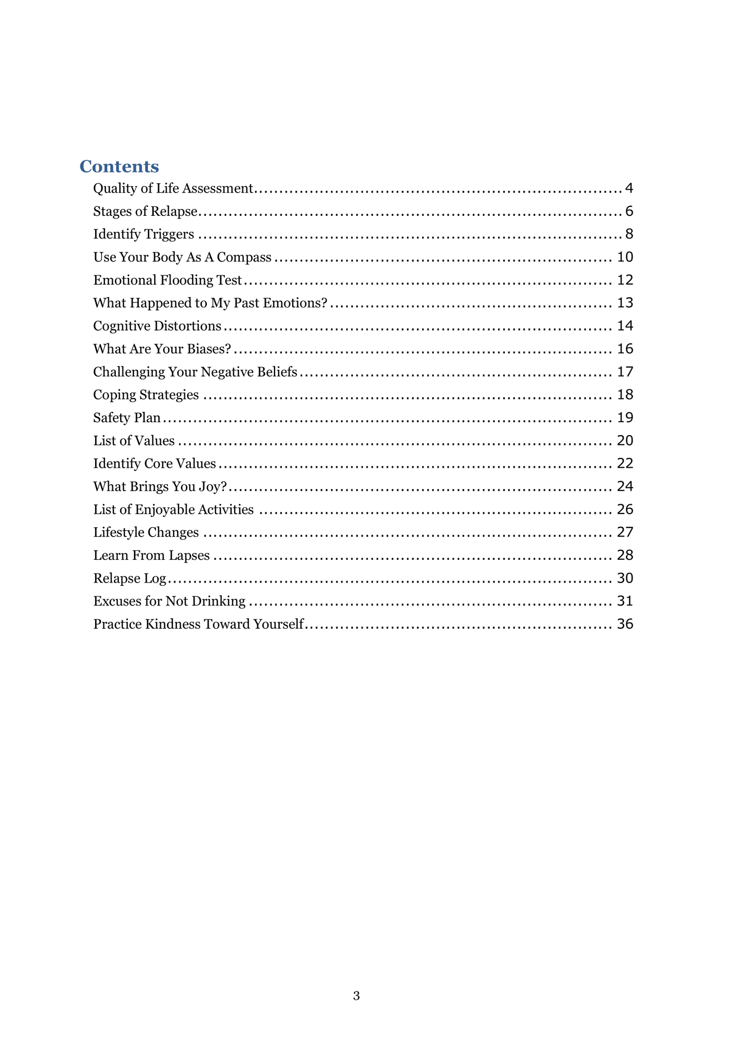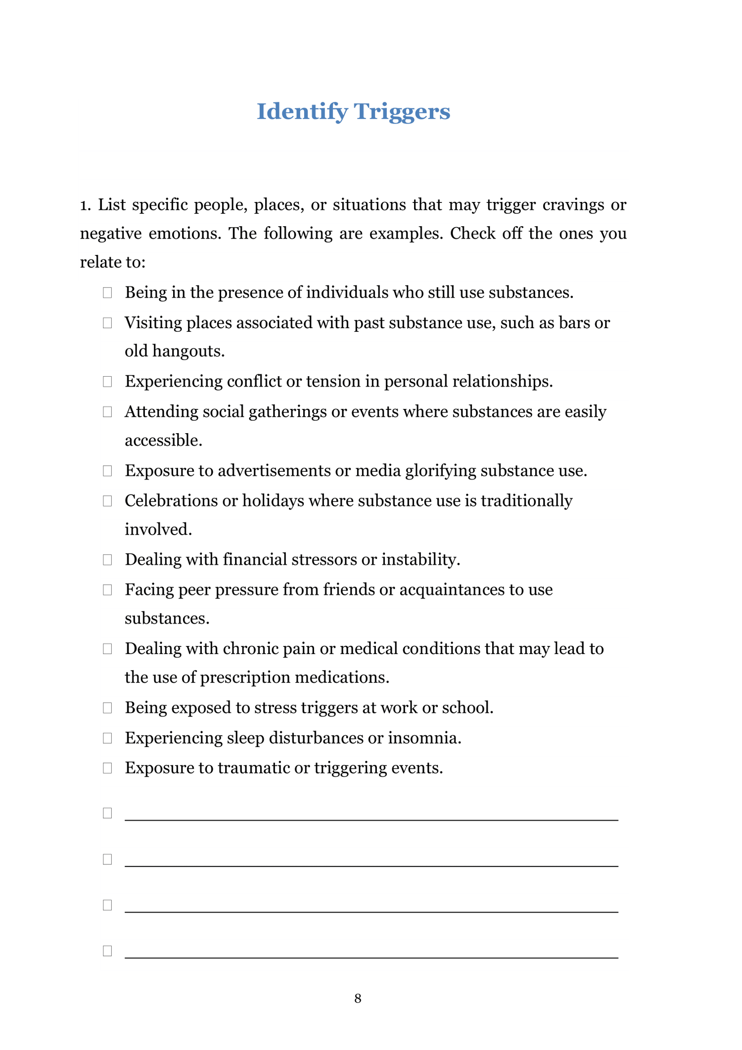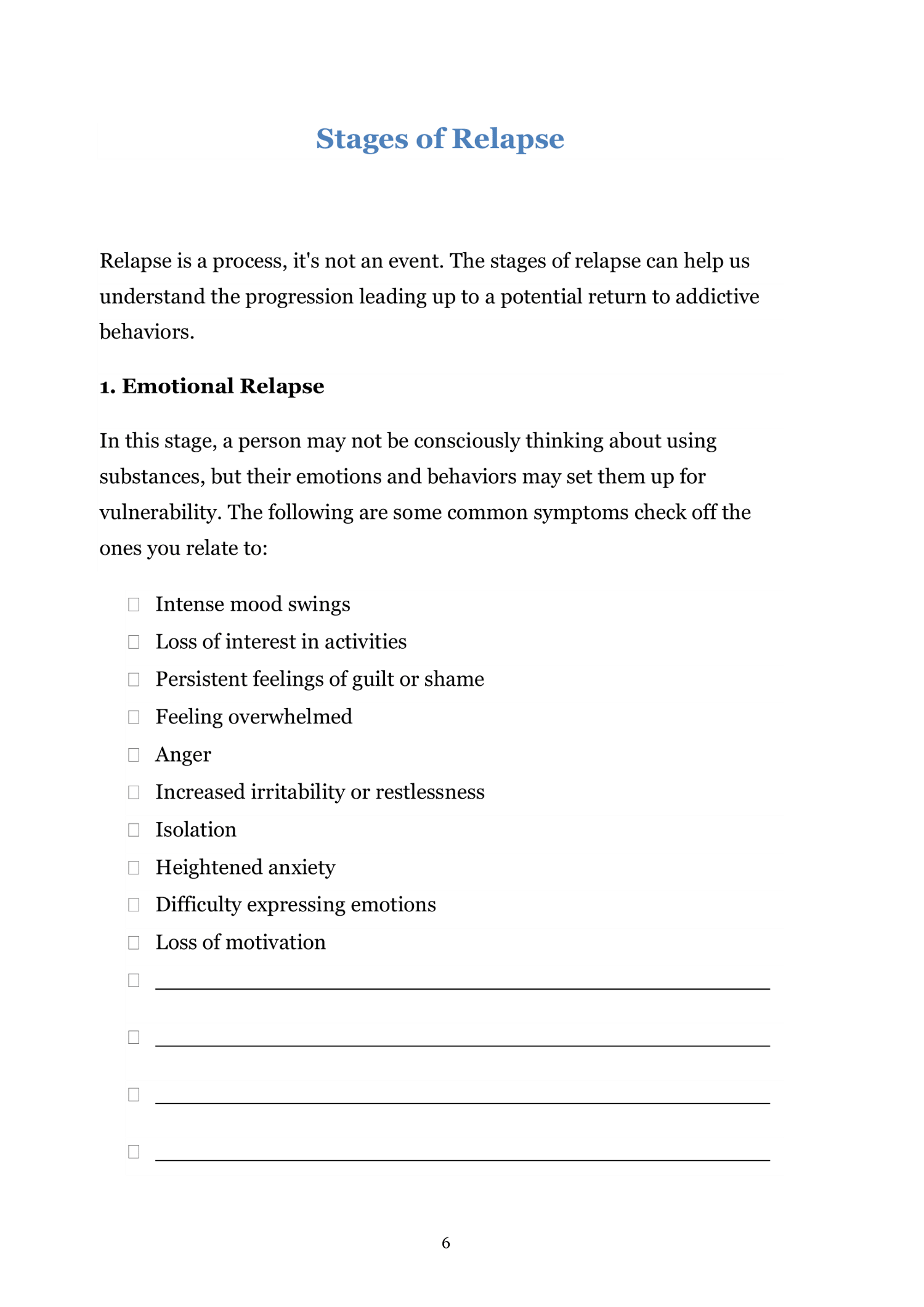 +35 Pages of evidence-based activities and prompts to help you prevent relapse.