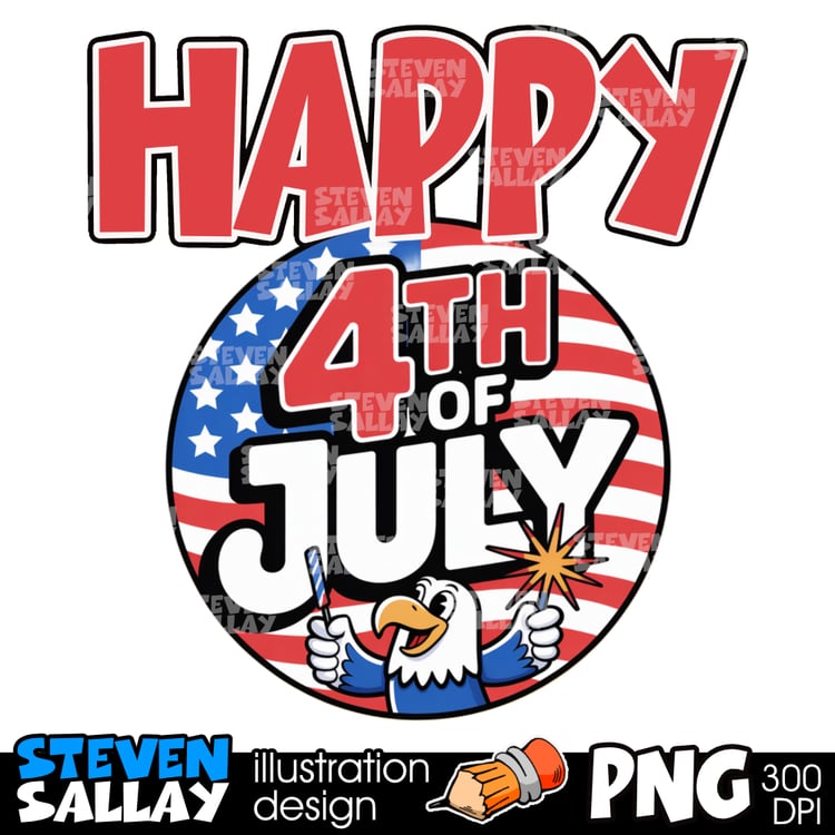 Celebrate Independence Day with this 4th of July cartoon clipart, perfect for patriotic designs, party invitations, t-shirts, stickers, posters, and digital projects. This festive Independence Day illustration features a fun, bold cartoon style ideal for summer crafts, sublimation, print-on-demand, and DIY projects. Great for designers, small businesses, and creators looking for eye-catching patriotic clipart.