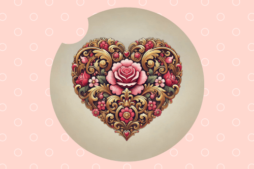 Add a romantic touch to your car décor with this Royal Heart with Flowers Sublimation Design, featuring an elegant floral heart. Perfect for creating personalized car coasters with a charming Valentine's theme.
