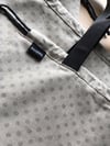 Mede entre 32-35 cms por 32-38 cms, tem um bolso interior, alças em pele feitas a partir de desperdício da indústria do calçado.