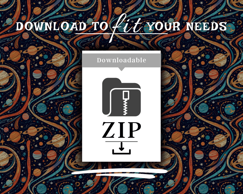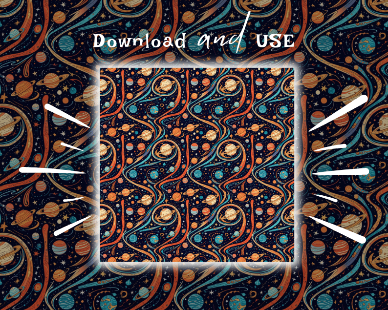 Step into the cosmic rhythm with our Planetary Orbits Pattern Collection – a stunning set of over 50 space-inspired seamless patterns capturing the elegant motion of celestial bodies. Perfect for digital creatives, crafters, and designers, these high-resolution files are ideal for scrapbooking, sublimation, product packaging, wall art, apparel, and more.