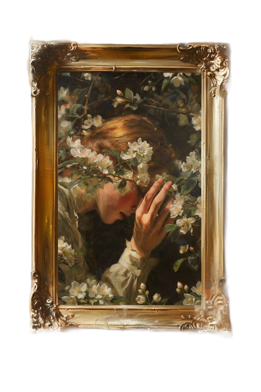 A bowed figure is enveloped by pale blossoms, her face half-hidden by flowers and hand alike. What should be light — petals, spring, beauty — presses close instead, becoming something heavy, intimate, and almost devotional. The scene feels private, as if the garden itself has leaned in too far, asking something it should not.