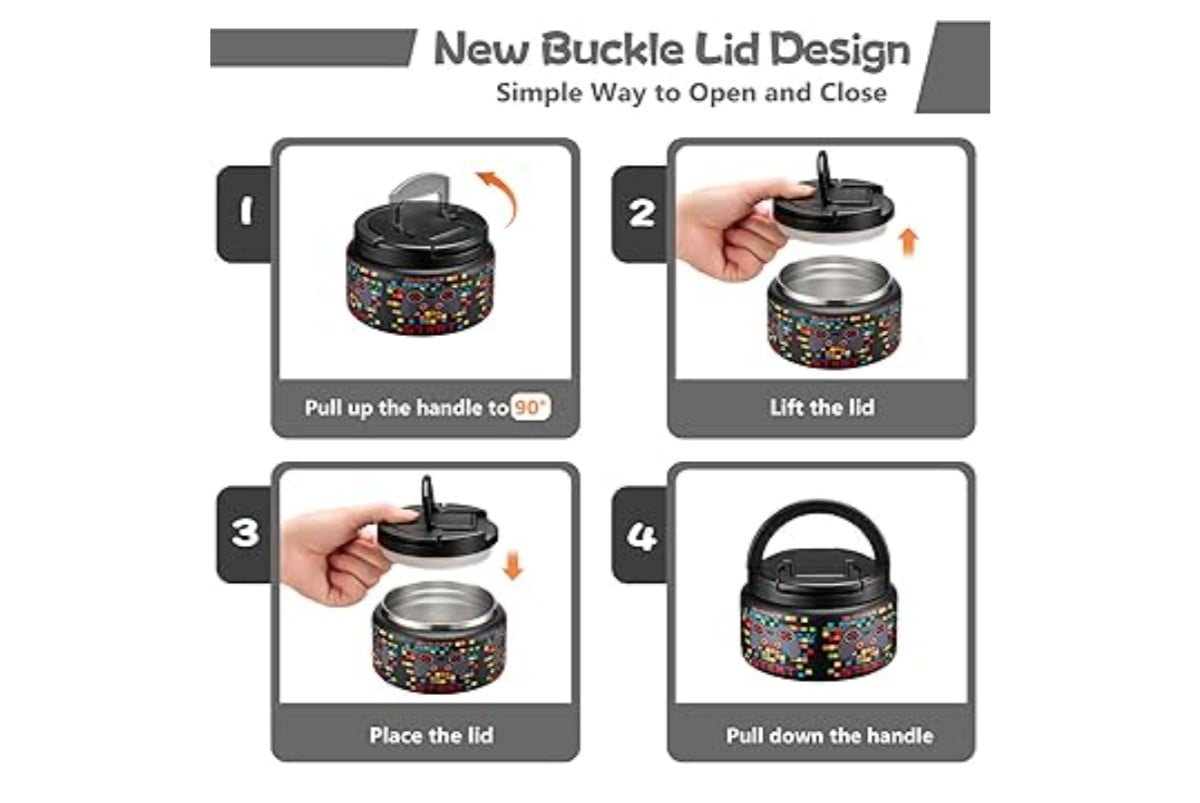 New Buckle Structure Lid: Our food containers are made with a press-seal construction, simply pull the handle upwards to 90° to open the lid, this is very child friendly so children's small hands can also open it easily. And it also comes with a carrying handle to make it easy for your child to carry it.Each part of the lid is removable, making it very easy to clean thoroughly and leave the insulated canister completely clean.