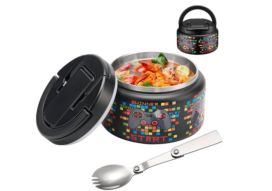 13.5oz Soup Thermo for Hot Food Kids Insulated Vacuum Food Jar with Buckle Lid,Wide Mouth Leakproof Stainless Steel Lunch Container with Spoon-Black Game