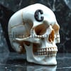 The letter C skull obsidian marble deeply engraved character on the forehead of a white marble skull. The character, filled with dark obsidian, contrasts sharply against the pale skull. Set against a black crystalline background, the skull and character dominate the image.