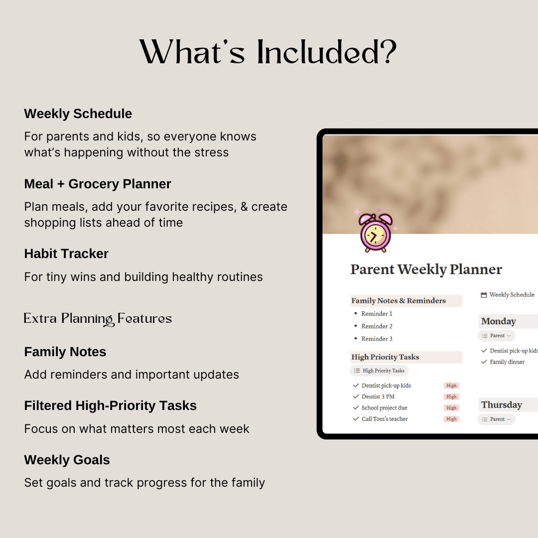 Keep your family organized, stress-free, and on track with this all-in-one Notion planner! Perfect for parents who want clarity and simplicity, it helps you manage your week, track kids’ activities, plan meals, and build healthy habits all in one place.