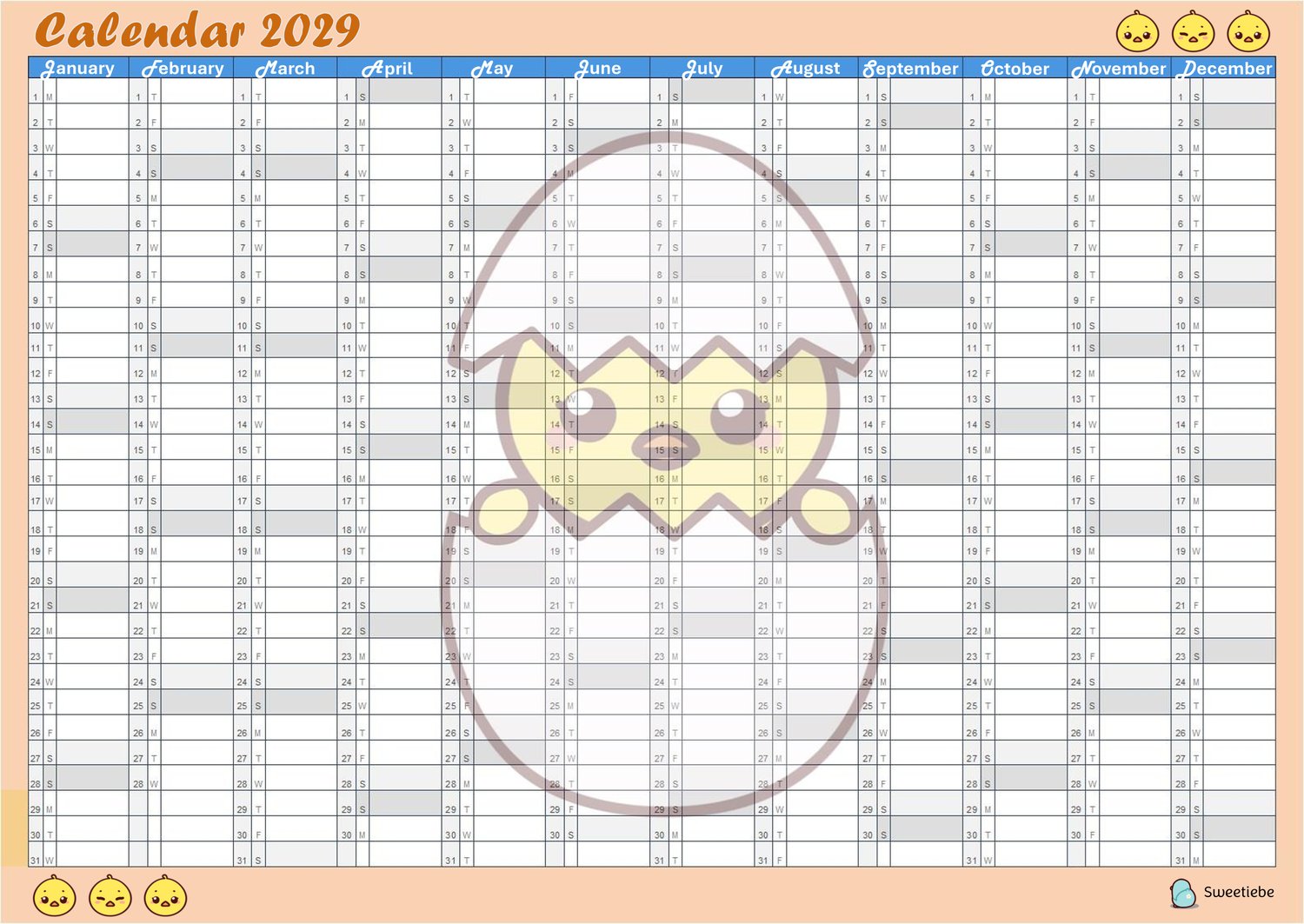 Quack your way through 2029 with this sweet duckling-themed calendar planner! Featuring a delightful little duck hatching from its egg, this single-page design is available as a versatile PDF file for digital use or printing. Whether you use it to organize your year on your devices or display it on your wall, this calendar will bring a smile to your face with its charming design. Perfect for duck enthusiasts, animal lovers, or as a thoughtful gift!