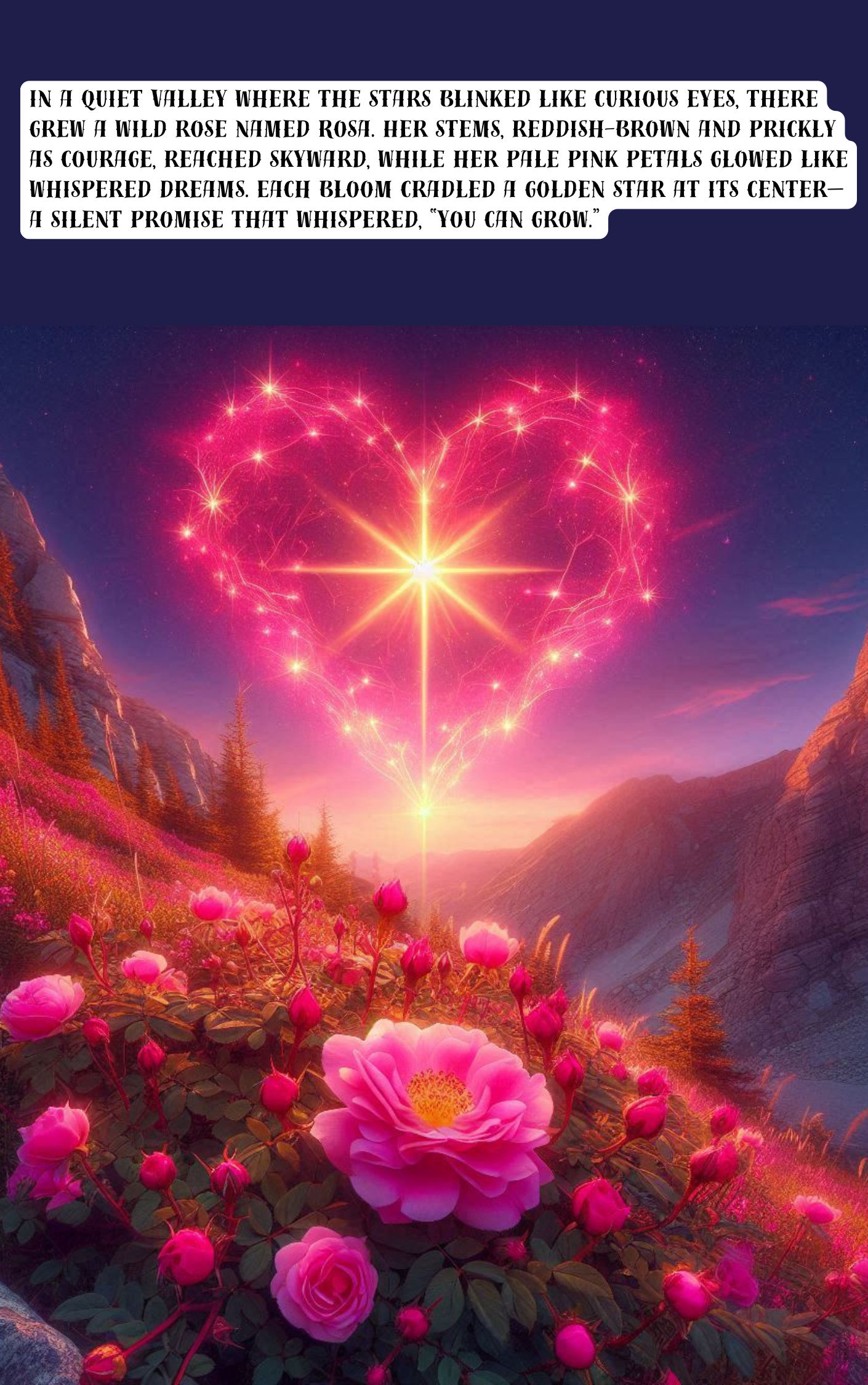 In a rugged valley where stars blink like curious eyes, a wild rose named Rosa dares to bloom. Her petals cradle golden stars, her thorns guard a heart that refuses to break, and her roots reach through stone—not because it’s easy, but because it’s worth it.