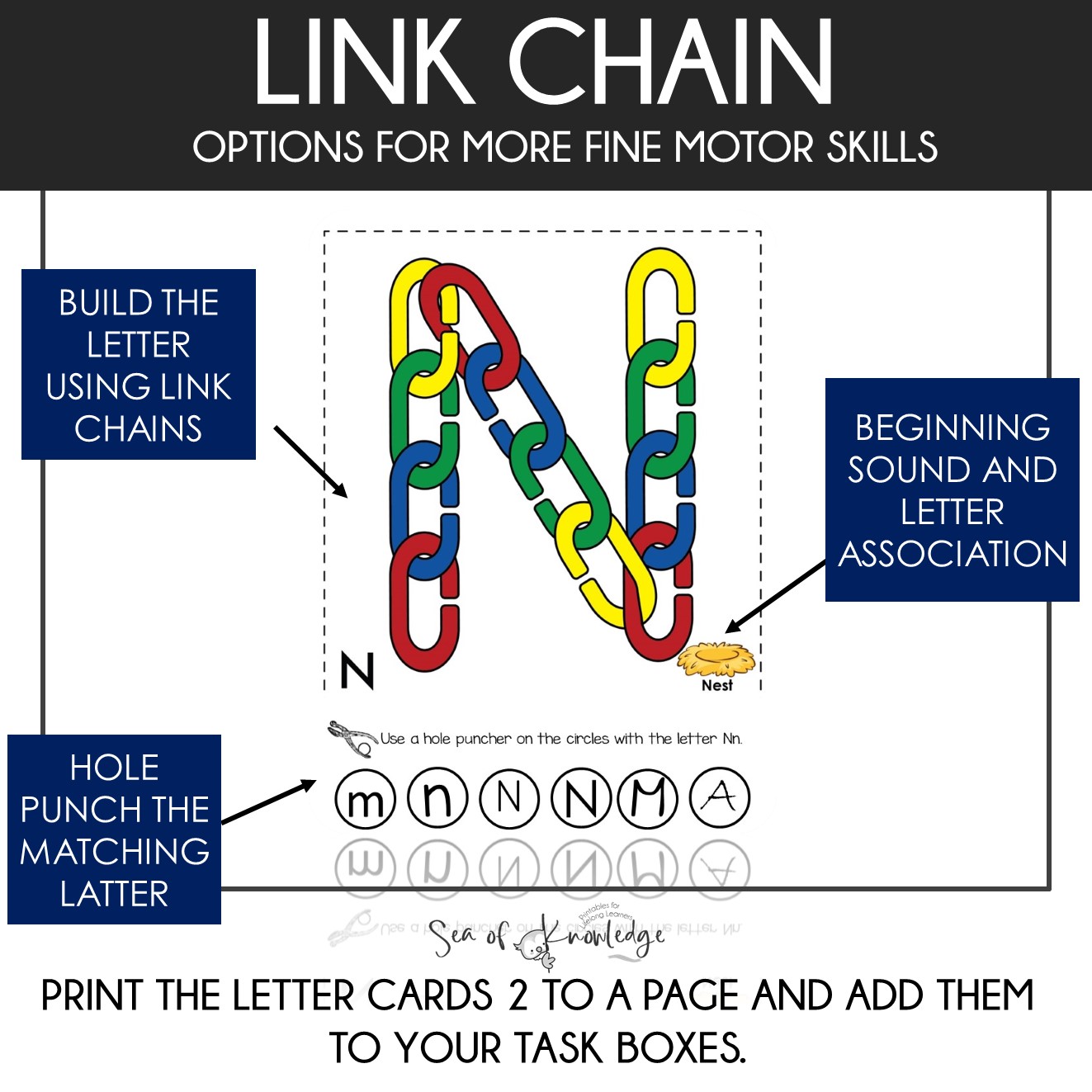 Help your preschoolers learn their ABCs with these fun low prep Link Chain Letters Task Cards! These Alphabet Fine Motor Cards are a FUN, hands on way to explore and learn all about letters, the best part is that there are options to also use hole punchers with this set of task cards. Just print the blackline version and have them set up in task boxes for future use.