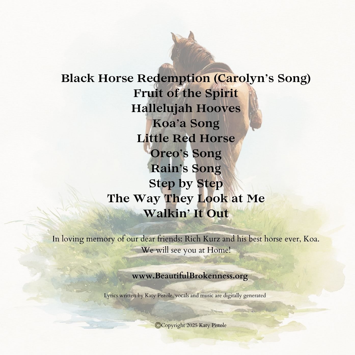 Katy's debut album is a collection of 10 worship songs born in the barn — written through years of walking with Jesus and walking beside horses and humans who had forgotten how to trust. Each track reflects the heart of the gospel: Rescue. Redemption. Reconciliation. With songs like “Hallelujah Hooves,” “Black Horse Redemption,” and “Rain's Song" every note tells a story of freedom. We’re so glad you’re here. Let this music draw you home.