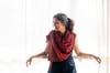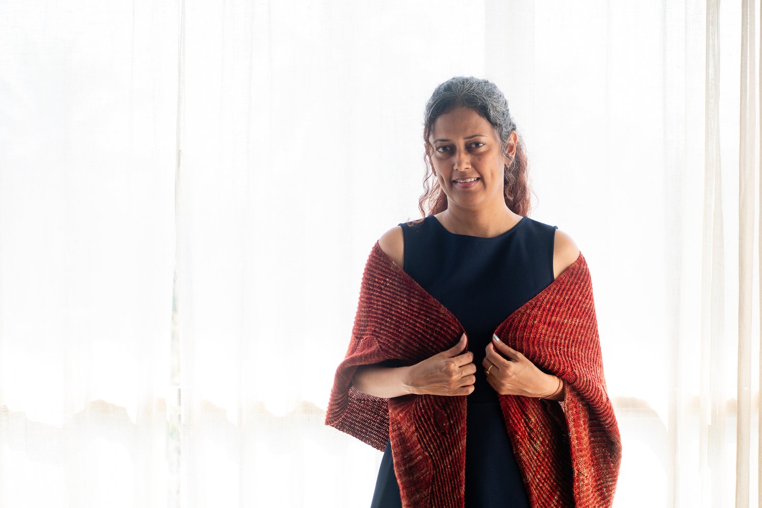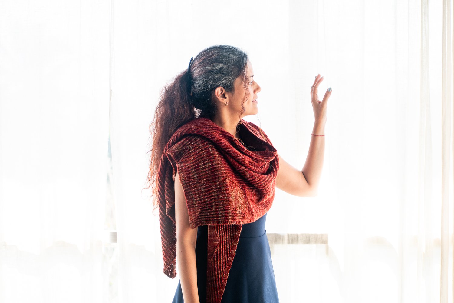 I like working with twisted stitches and many of my designs have an element of twisted rib in them. In this design, twisted stitches meander through the wrap as though forming pathways through tall trees of twisted rib, sometimes unevenly broken by a clearing of sorts.“ – Nidhi Kansal