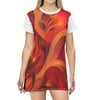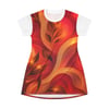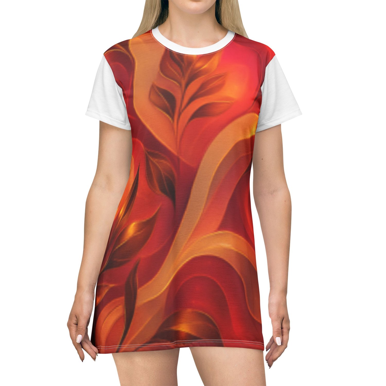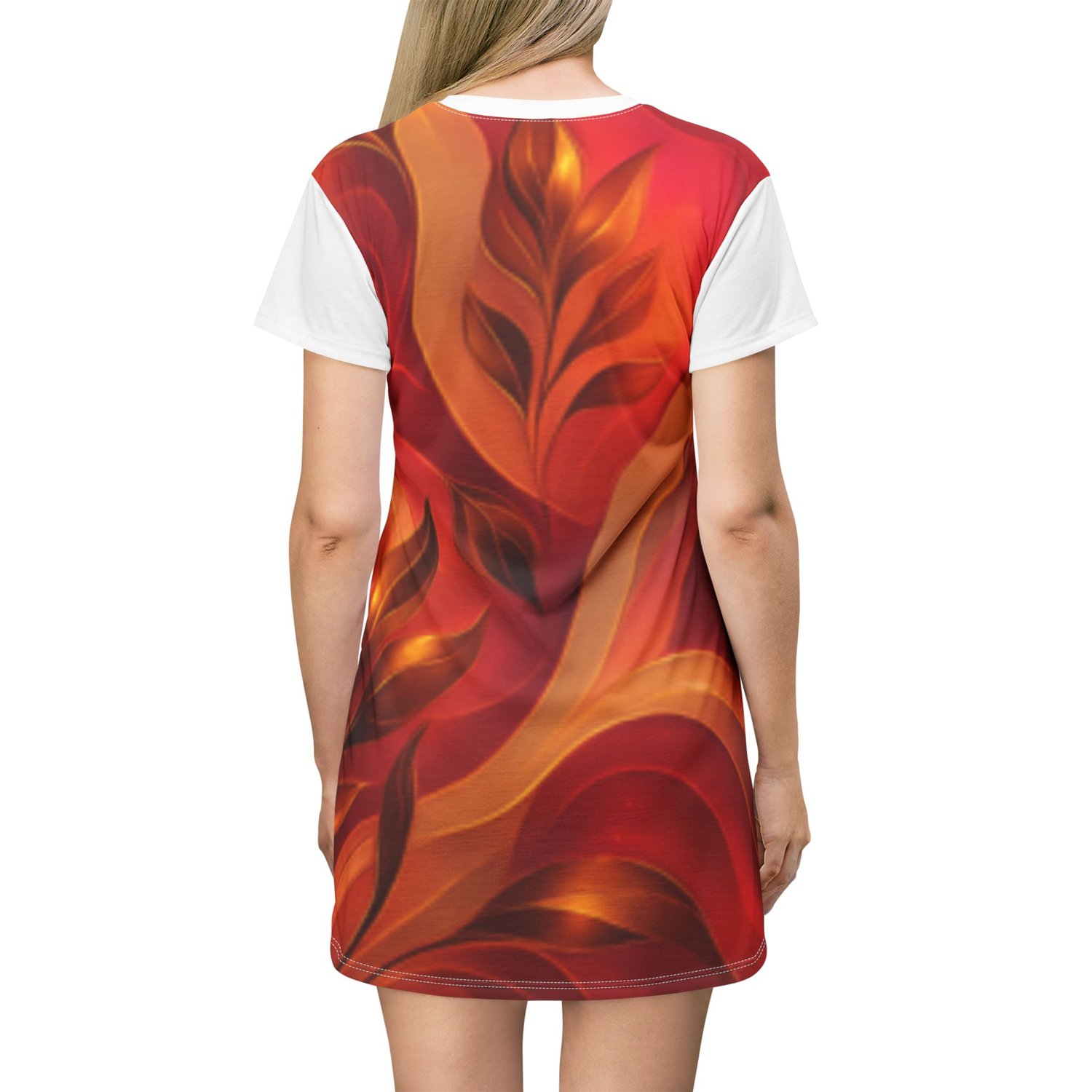 Autumn Flame Leaf Pattern T-Shirt Dress | Red Orange Swirl AOP