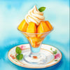 A refreshing watercolor of mango slices and soft cream in a glass, evoking the taste of summer sweetness. The soft blue background adds a cool and relaxing mood. It’s a delightful mix of freshness, color, and calmness in one painting.
