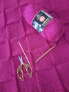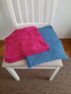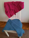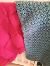 A takarókat Himalaya Everyday 100g/250 m fonalból kötöttem (a képen látható takarót 70004 ciklámen színből). 4 mm-es 80 cm-es körkötőtűt használtam, ezzel megfelelőnek tűnik a kész darab textúrája – kellően puha, rugalmas, sem tömör, sem laza. Cél a kb 60 x 70 cm-es méret, az enyém készen 62 x 76 cm lett.