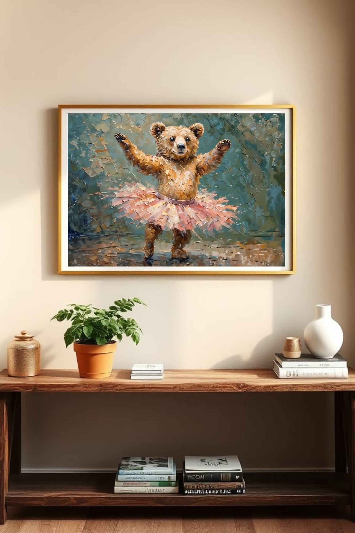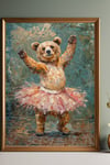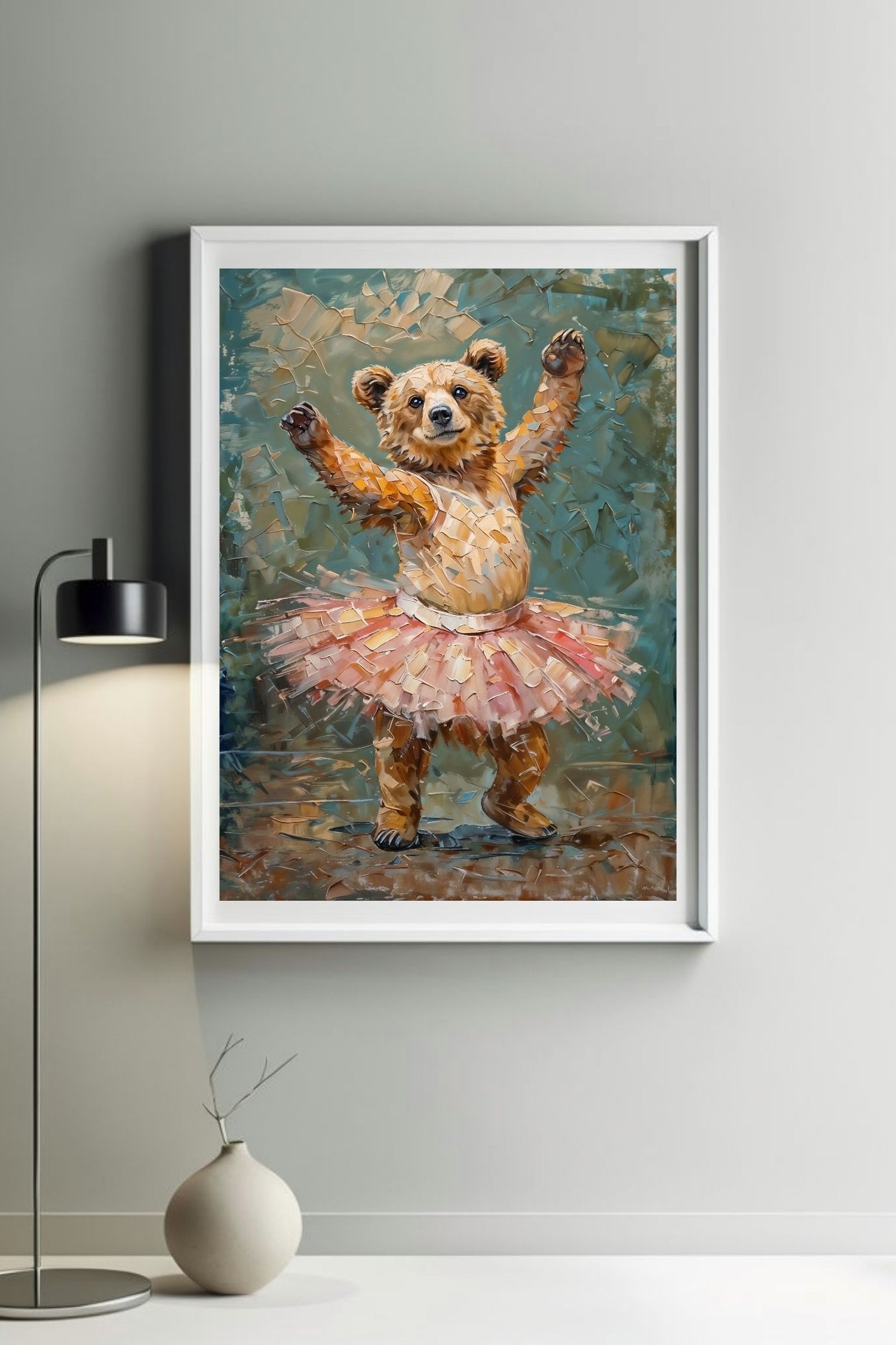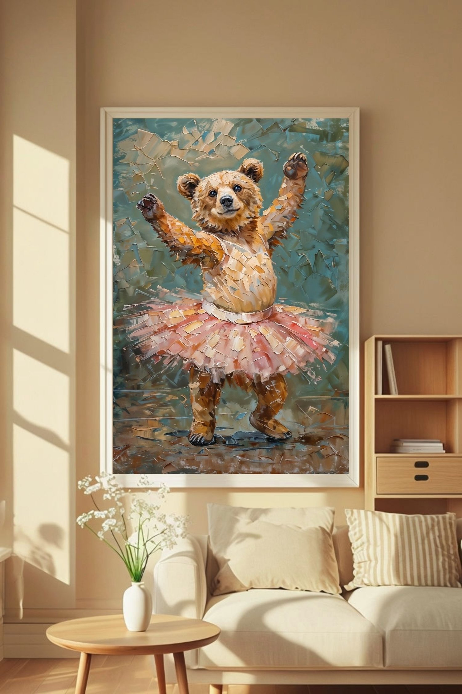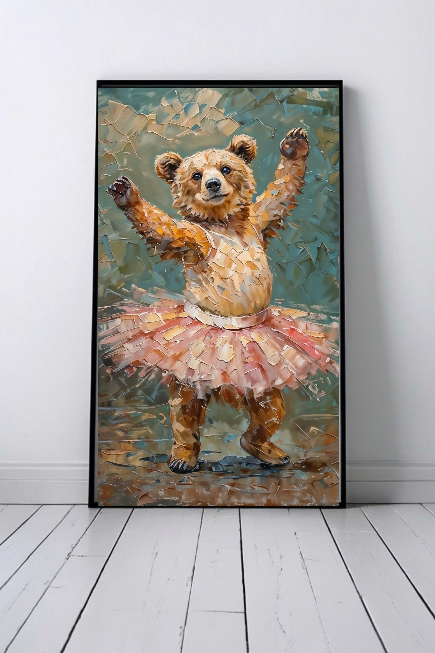 Brighten your space with this enchanting Dancing Bear Ballet Wall Art β featuring a lovable bear in a pink tutu, captured mid-pirouette in a beautifully textured oil painting style. Itβs a delightful blend of charm and elegance thatβs perfect for both children and art lovers alike.