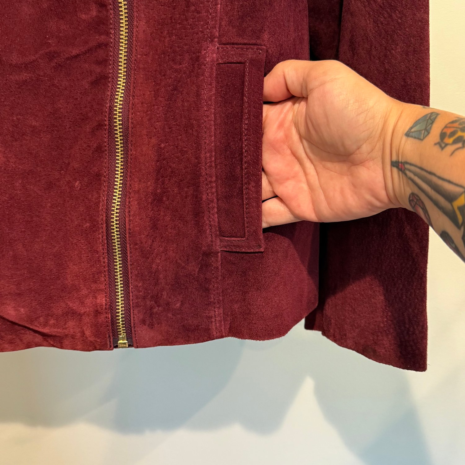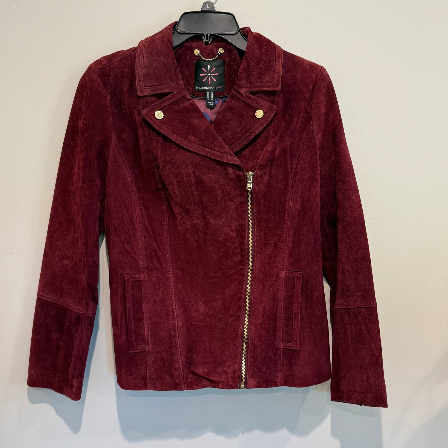Isaac Mizrahi Live from QVC wine burgundy suede jacket with pockets, a back slit, an A-symmetrical zipper and gold tone metal hardware.