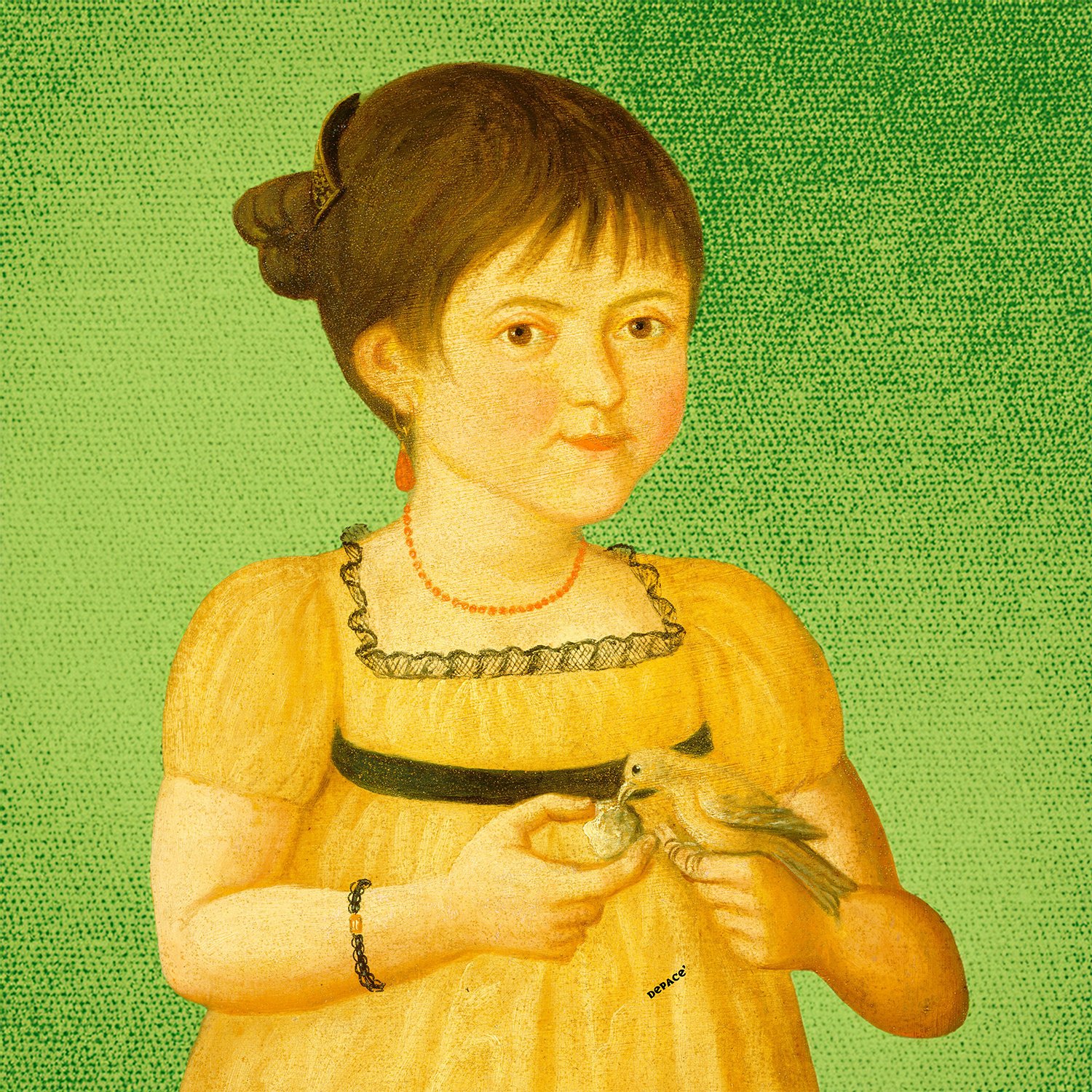 An 1800s girl extends her hand to a small bird, her grace meeting rebellion on a grungy pop-art canvas alive with color and contrast.