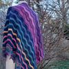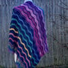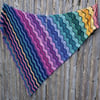 Oscillate, reminiscent of oscillating waves, is an asymmetrical triangular-shaped shawl consisting of a simple lace pattern with garter ridges interspersed.