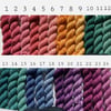 One skein of Marianated Yarns’ Practicality (75% superwash merino/25% nylon, 463 yds/100 g) in Bayou Blue (MC) and one set of Marianated Yarns’ Sheldon’s & Missy’s Snowflakes at Sunset 2022 Advent Calendar (75% superwash merino/25% nylon, twenty-four skeins, 46 yds/skein) in Kaleidoscope Dusk (CCs 1 through 24).