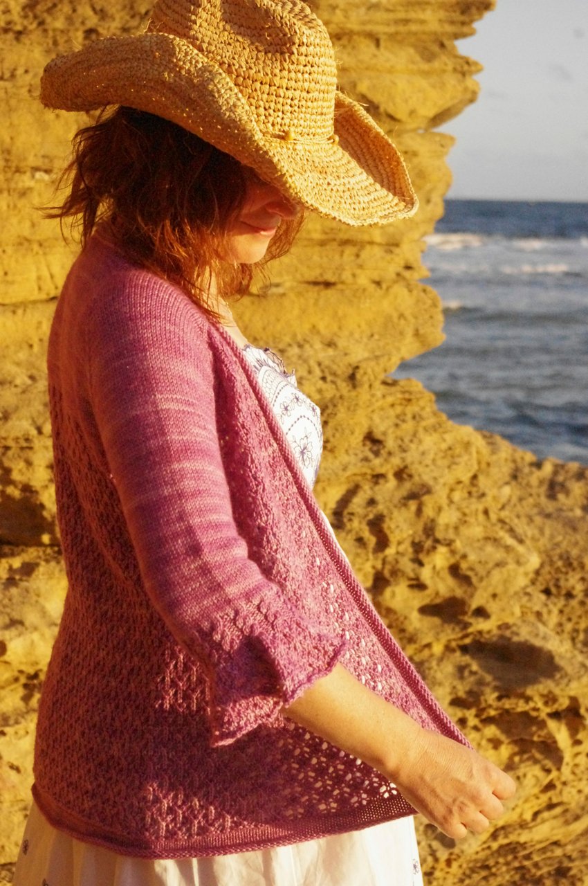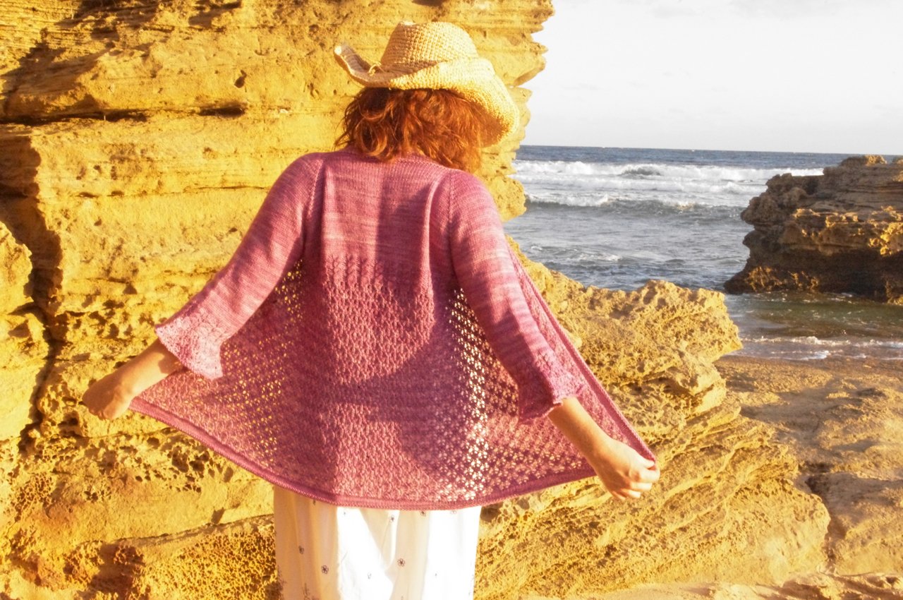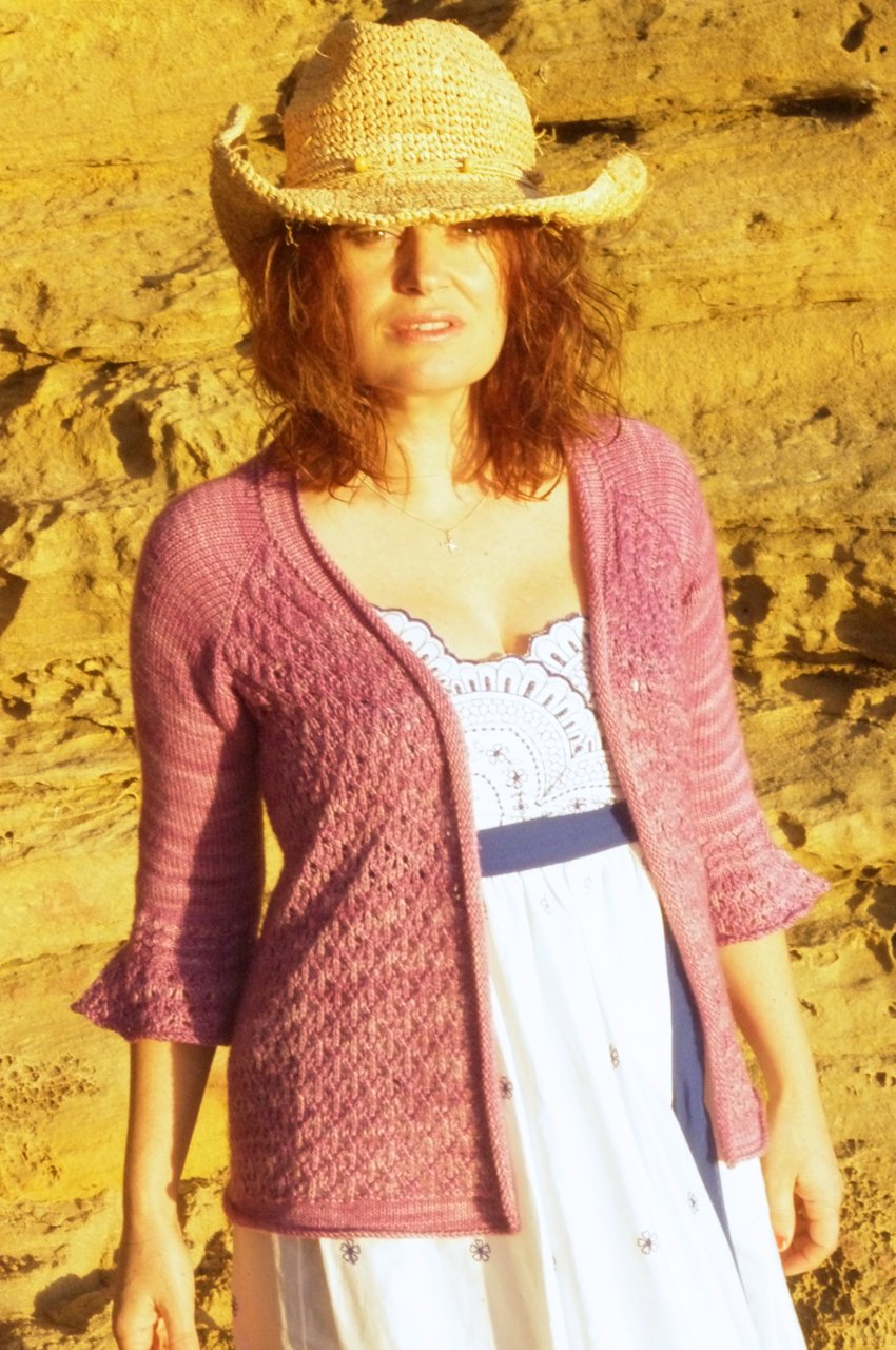 The perfect little Summer cardigan; open, lacy and lightweight. Lizzie knits up quickly and simply in beautiful lush 5 ply/sport weight yarns. This cardigan is simple and seamless with an interesting construction. Such a delightful garment is sure to become a well worn staple in the warmer months.