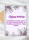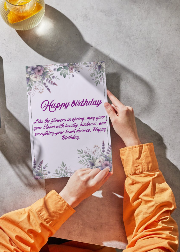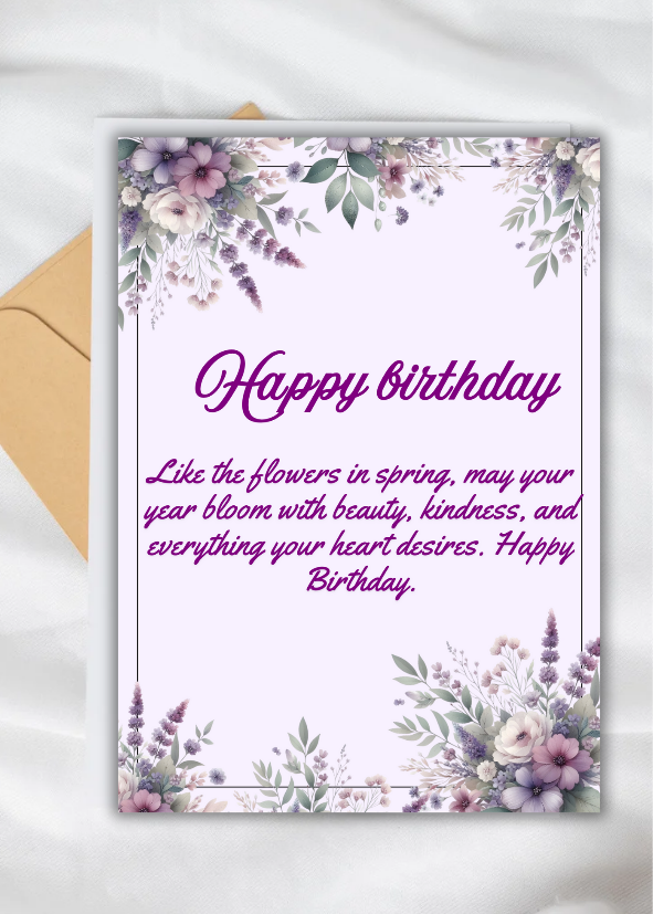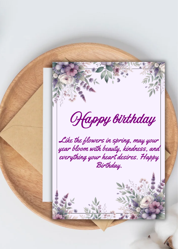 Celebrate a special birthday with our enchanting 'Happy Birthday' greeting card, inspired by the beauty of spring. This delightful floral card features graceful purple and lavender blooms with lush greenery, framing a heartfelt message: 'Like the flowers in spring, may your year bloom with beauty, kindness, and everything your heart desires. Happy Birthday.'