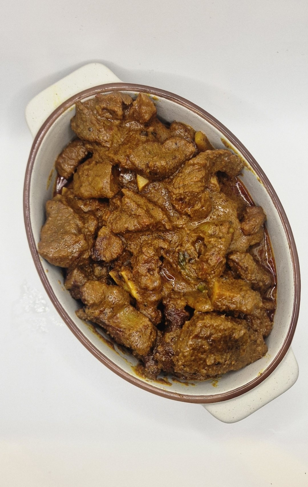 Traditionally, Curry Goat is served at festive gatherings and special occasions, often paired with rice and peas, roti, or plain white rice, sometimes with fried plantains or vegetables on the side.