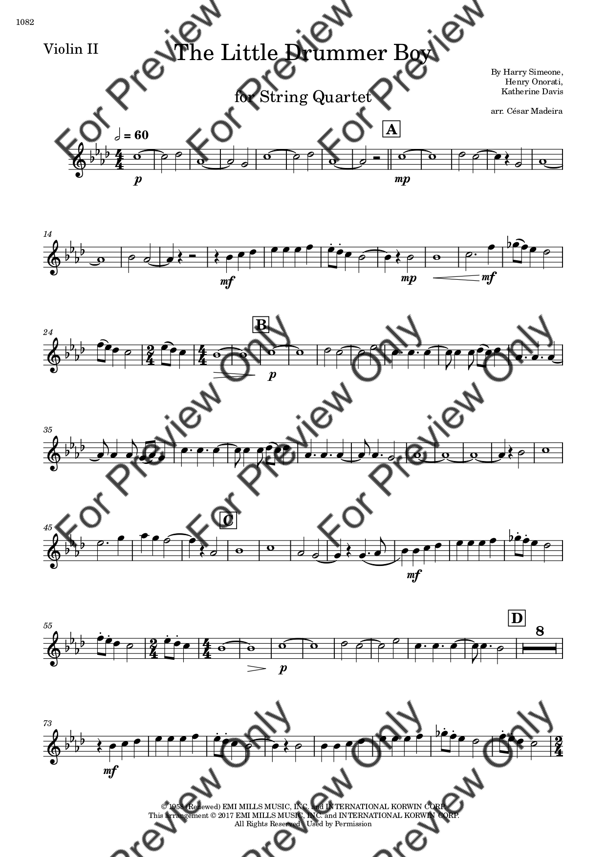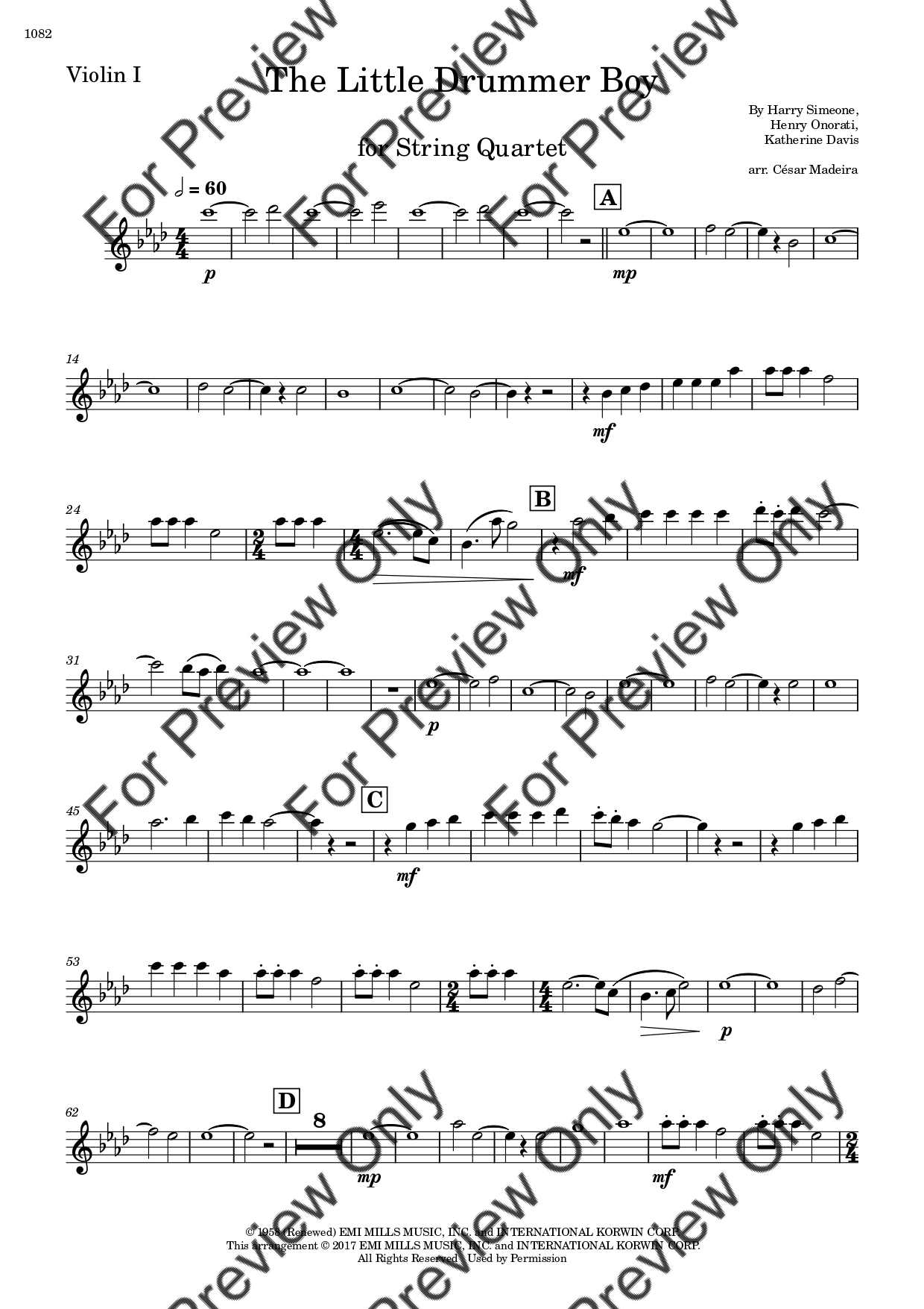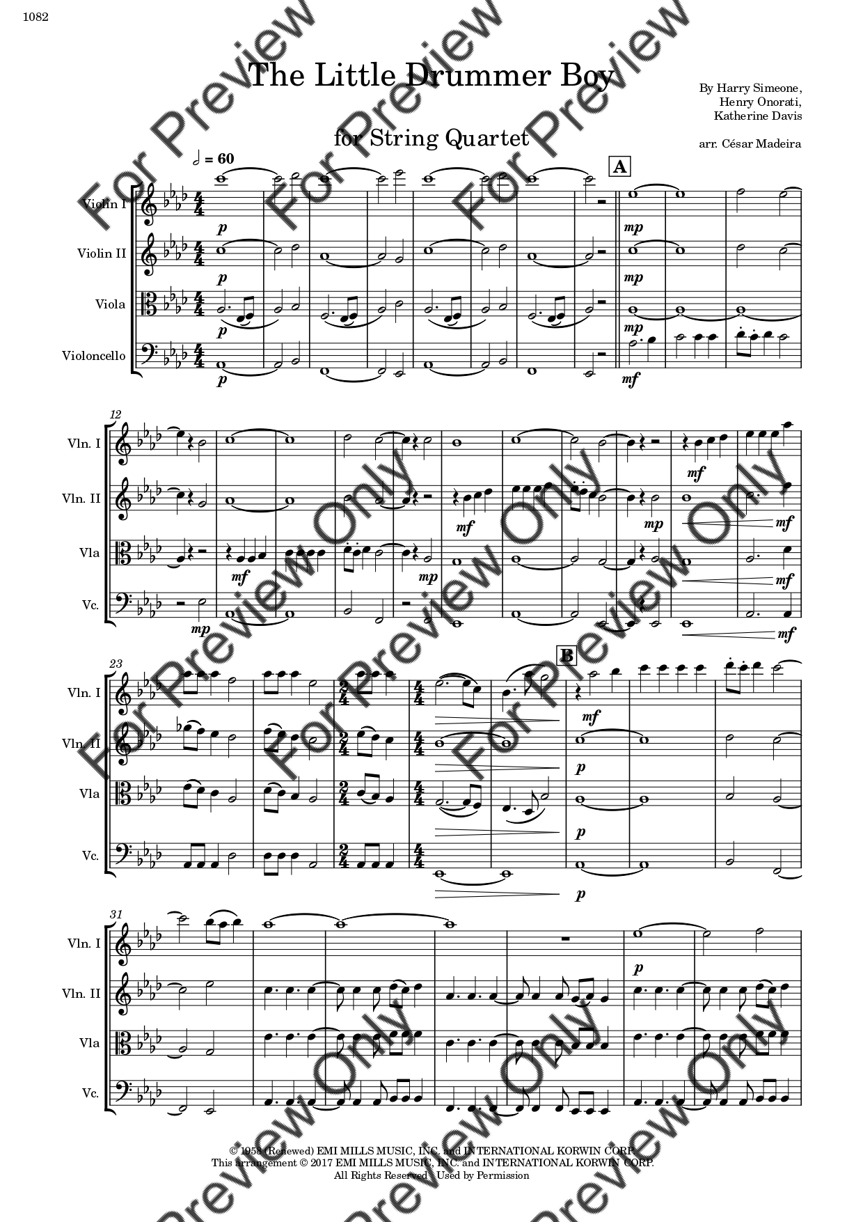 The Little Drummer Boy. Arrangement for String Quartet - Violin 1, 2, Viola and Violoncello. With Full Score and Individual Parts. Have fun!
