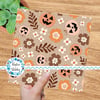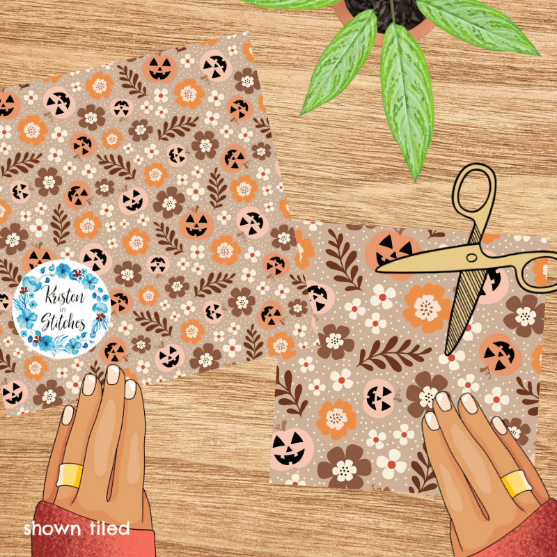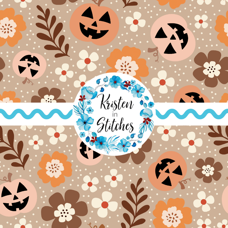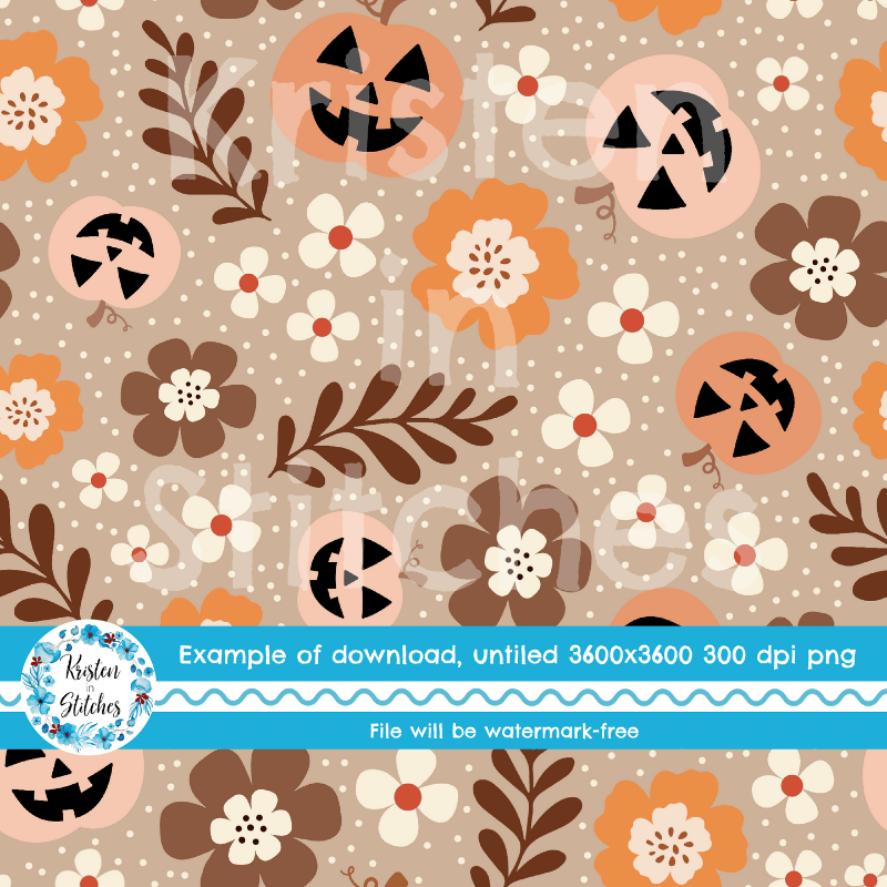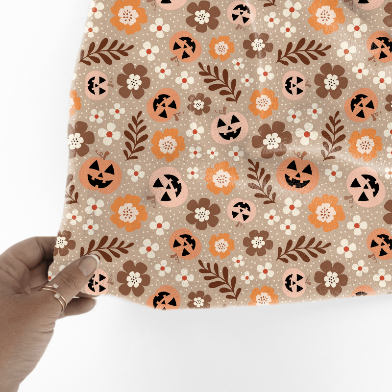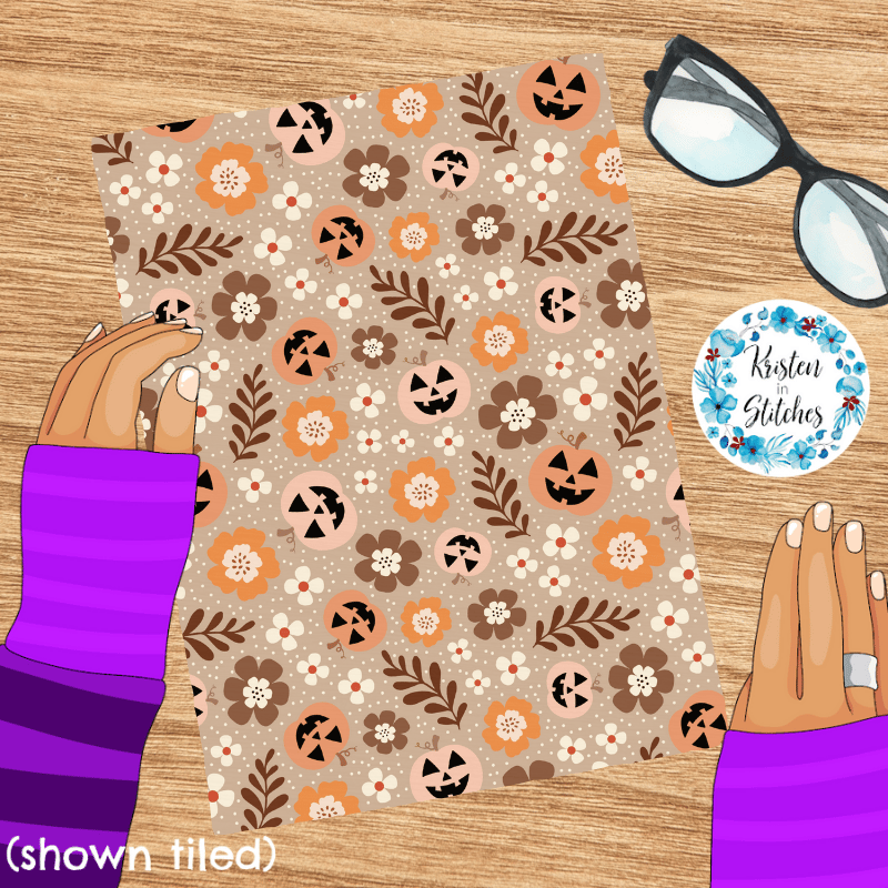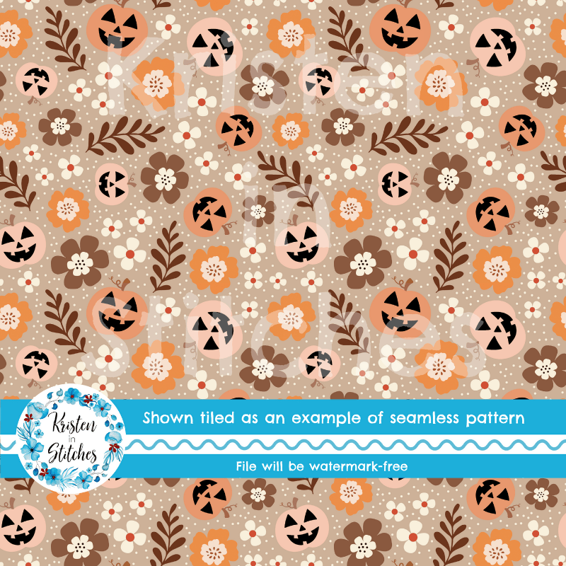 Pretty Jackolantern Pumpkin Fall Boho Floral Seamless Pattern, Autumn Flowers