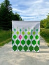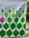 This vibrant modern quilt features a bold geometric design with stylized green leaves and a single standout pink leaf for contrast. Set against a crisp white background, the colors pop, while circular quilting adds texture.
