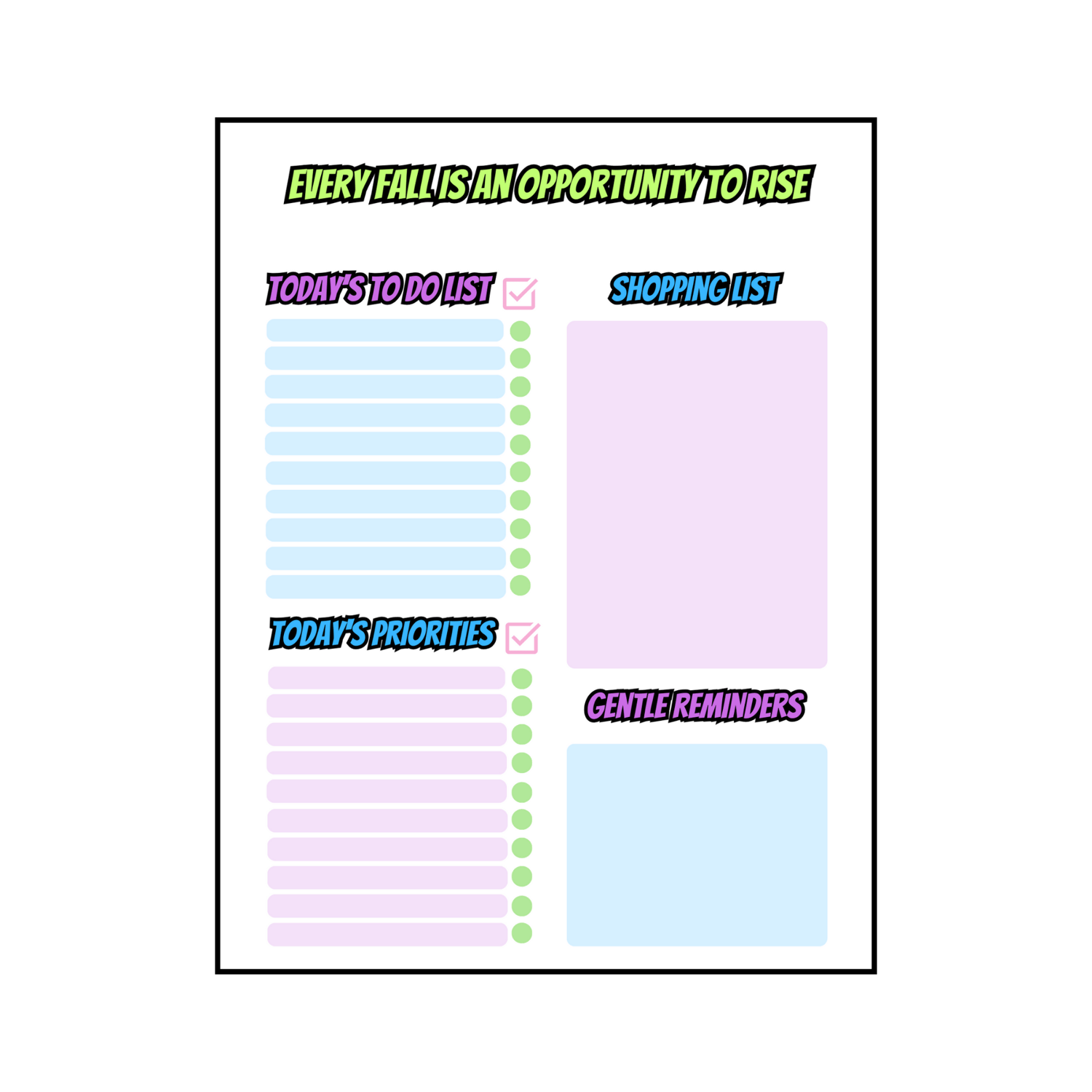 Daily Planner with Motivational Quotes. Using light but bright colours, this Daily Planner is hard to miss and can be used for all the family. In order to create the life we want, we need to first make a start. Starting is made easier with motivation. What better way to start your day then with a motivational quote to keep you inspired, on top of an easily accessible list of your daily tasks.