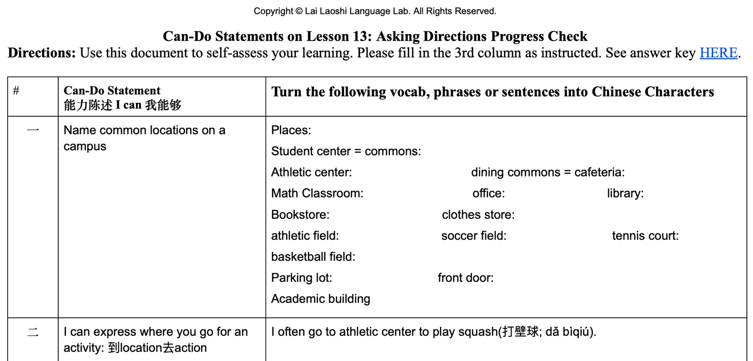 Progress Check是一个结合了Can-Do Statements和学生自测为一体的教学两用文档。第二列是这个单元的Can-Do Statements,第三列是要达到这个学习目标所需要的具体的生词,短语和例句。