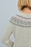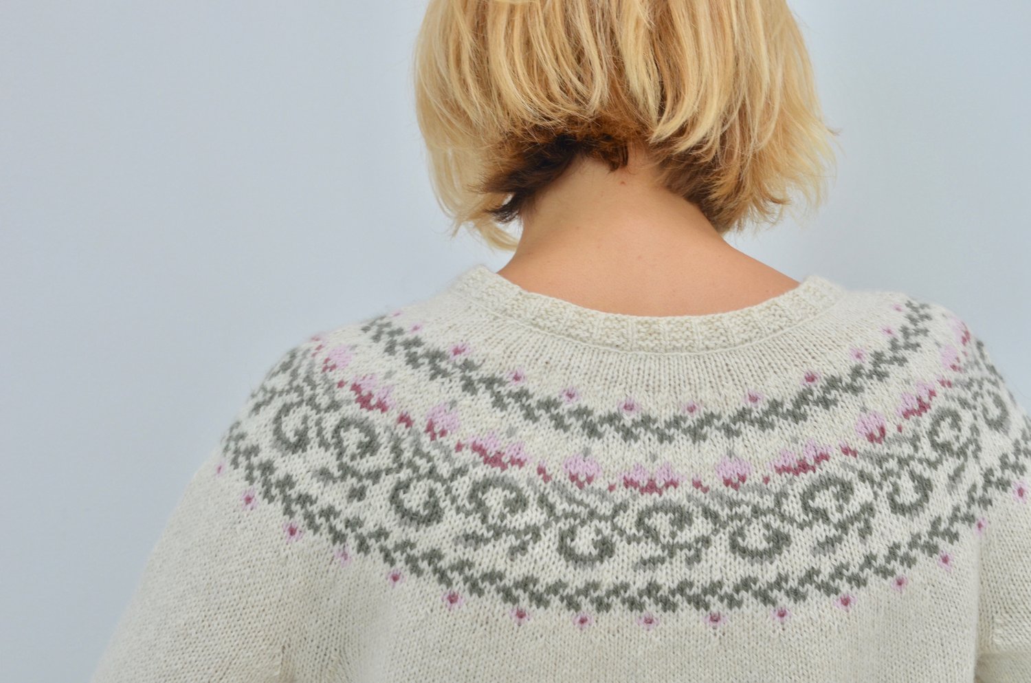 Sweet Briar is a lightweight yoke sweater encircled by flower and vine motifs. The silhouette is a relaxed but elegant A-line with bracelet length sleeves and lovely details of seeded rib at cuff, hem and collar.