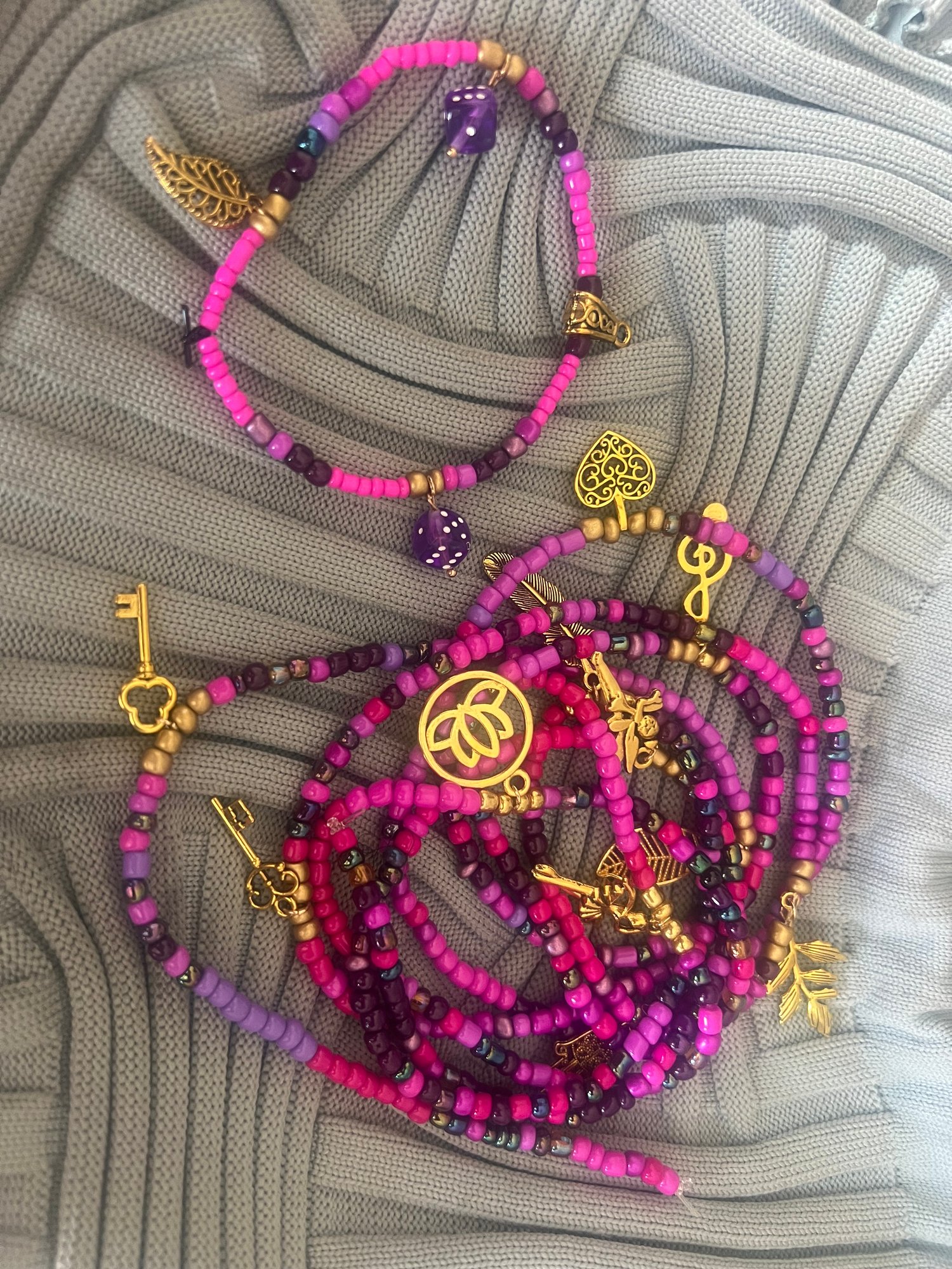 Pink and purple permanent waist bead set with faux gold charms