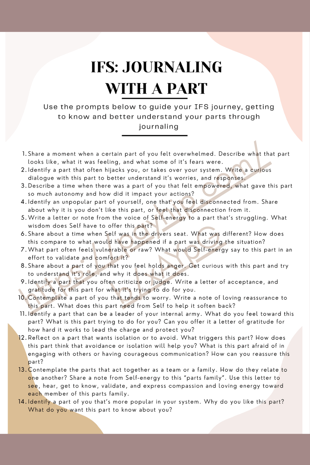 Improve the Self-part relationship using these guided journal prompts. Better understand protectors, and how Self-energy can help these target parts through each prompt.