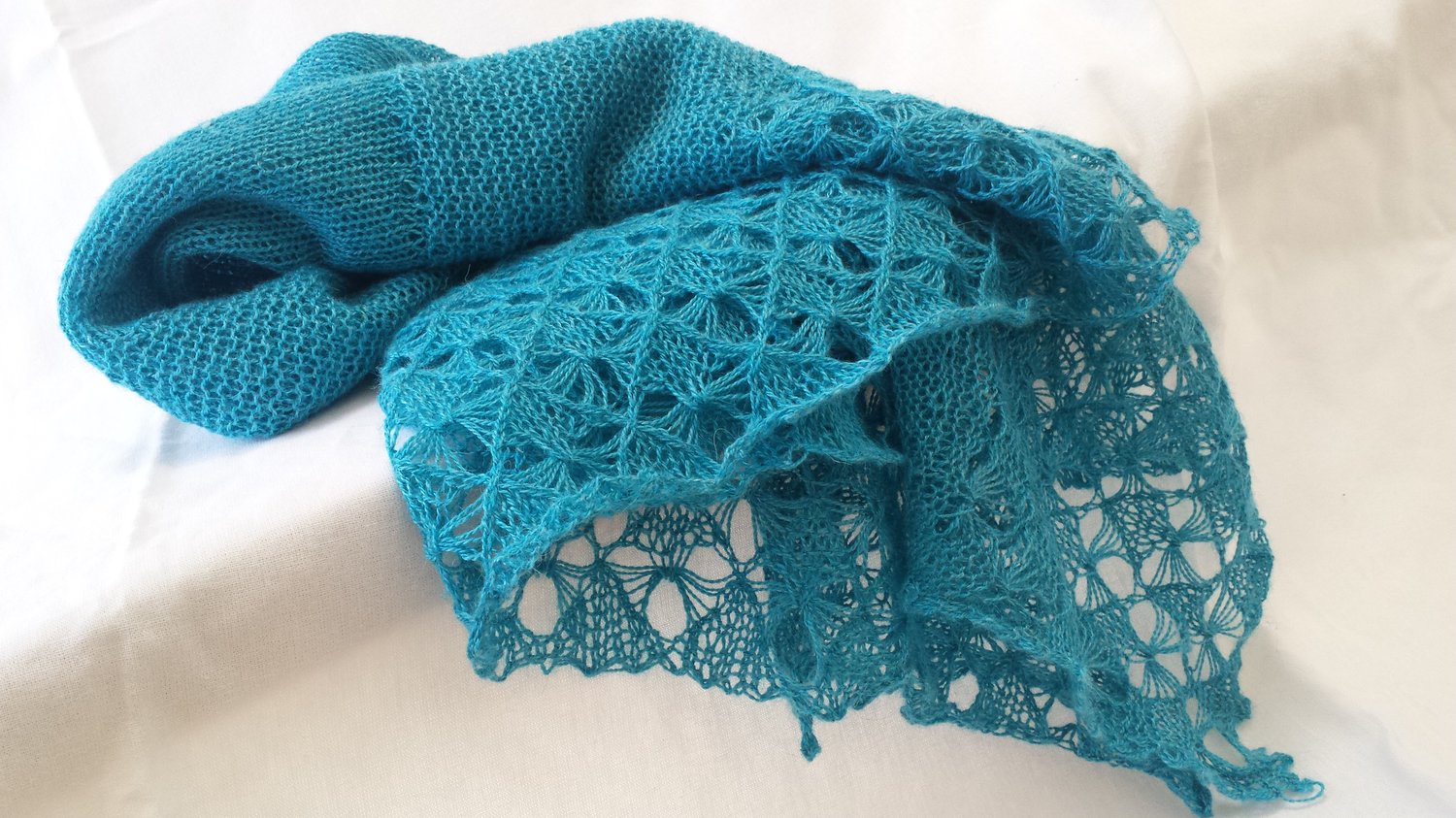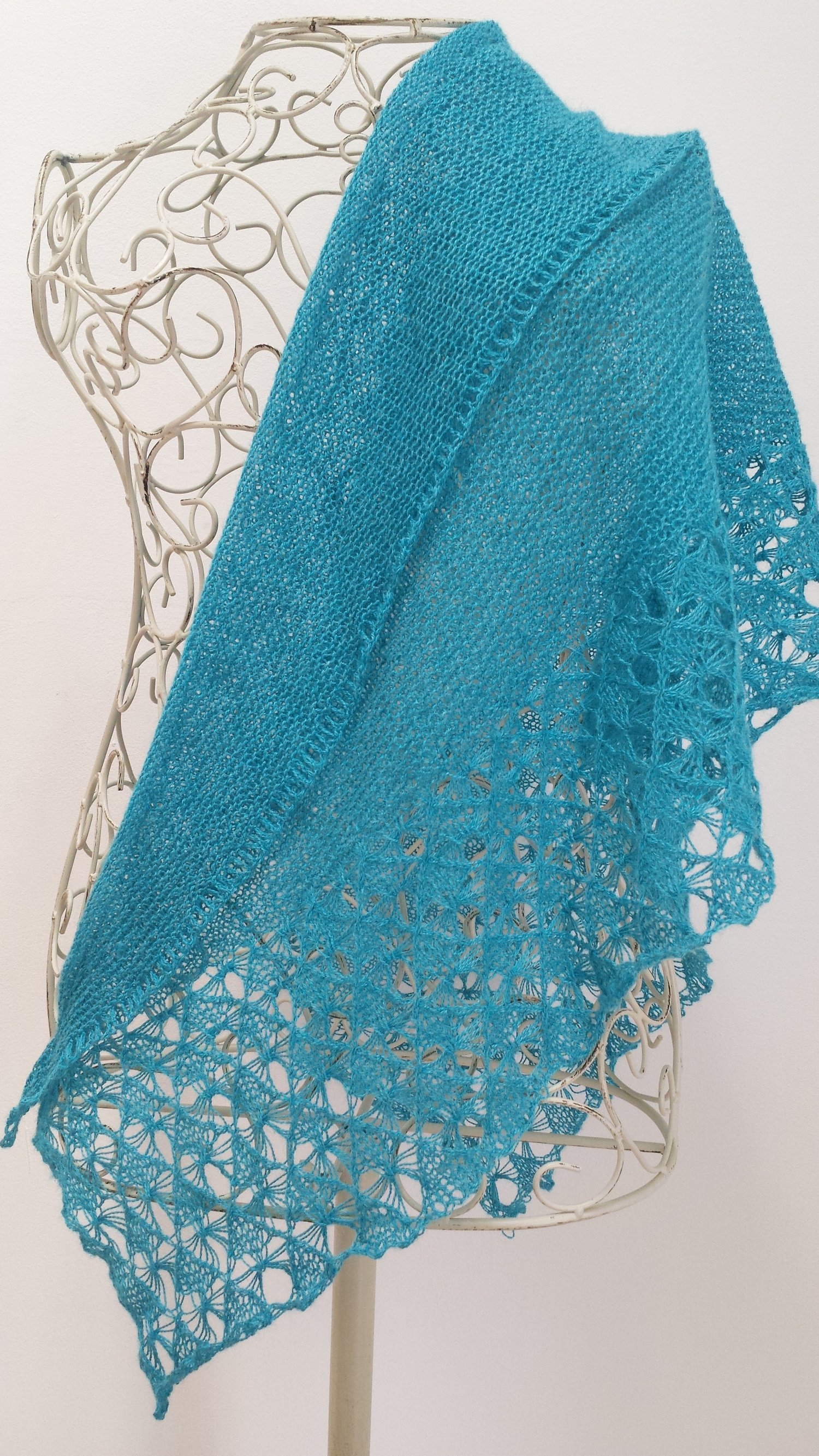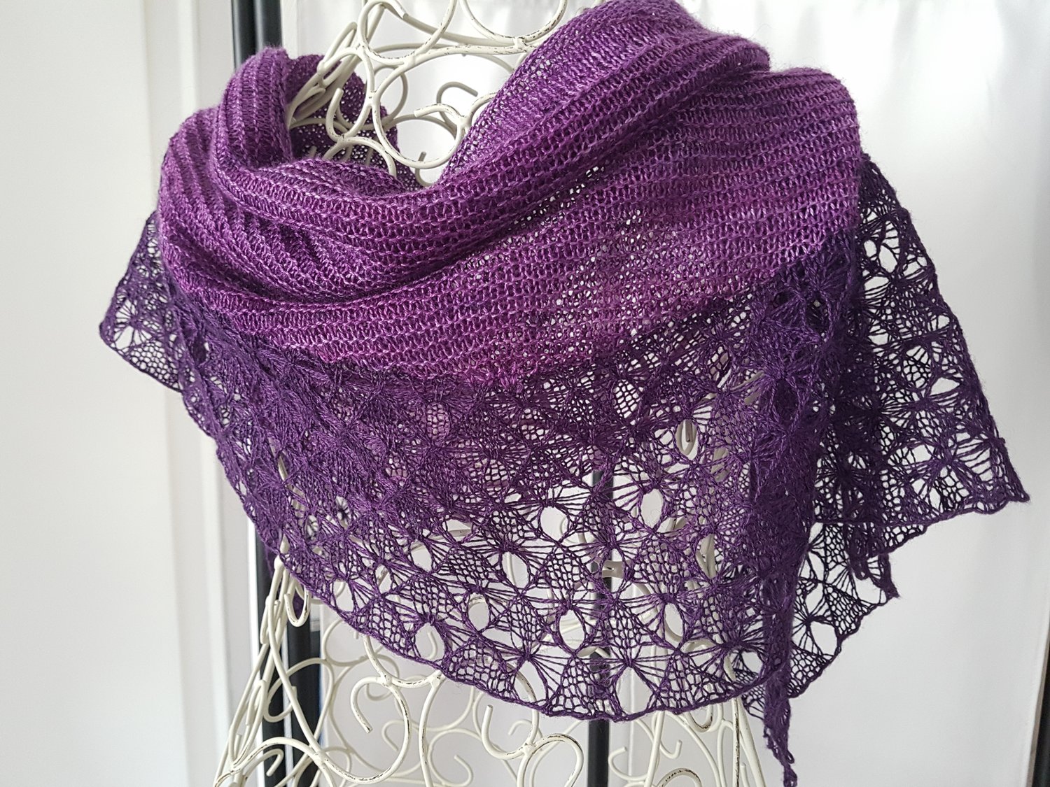 Prisma is an oval-shaped shawl with a lace border and a body worked in alternating garter and stocking stitch, short-row sections. The combination knit in a light (lace or fingering) yarn leaves you with a stunning shawl! It is knit from the bottom upwards.