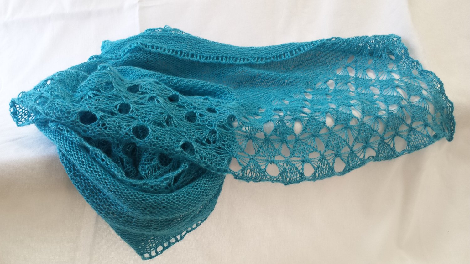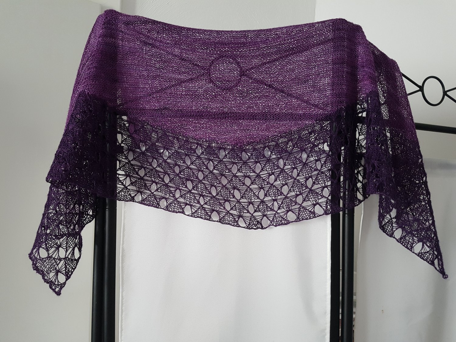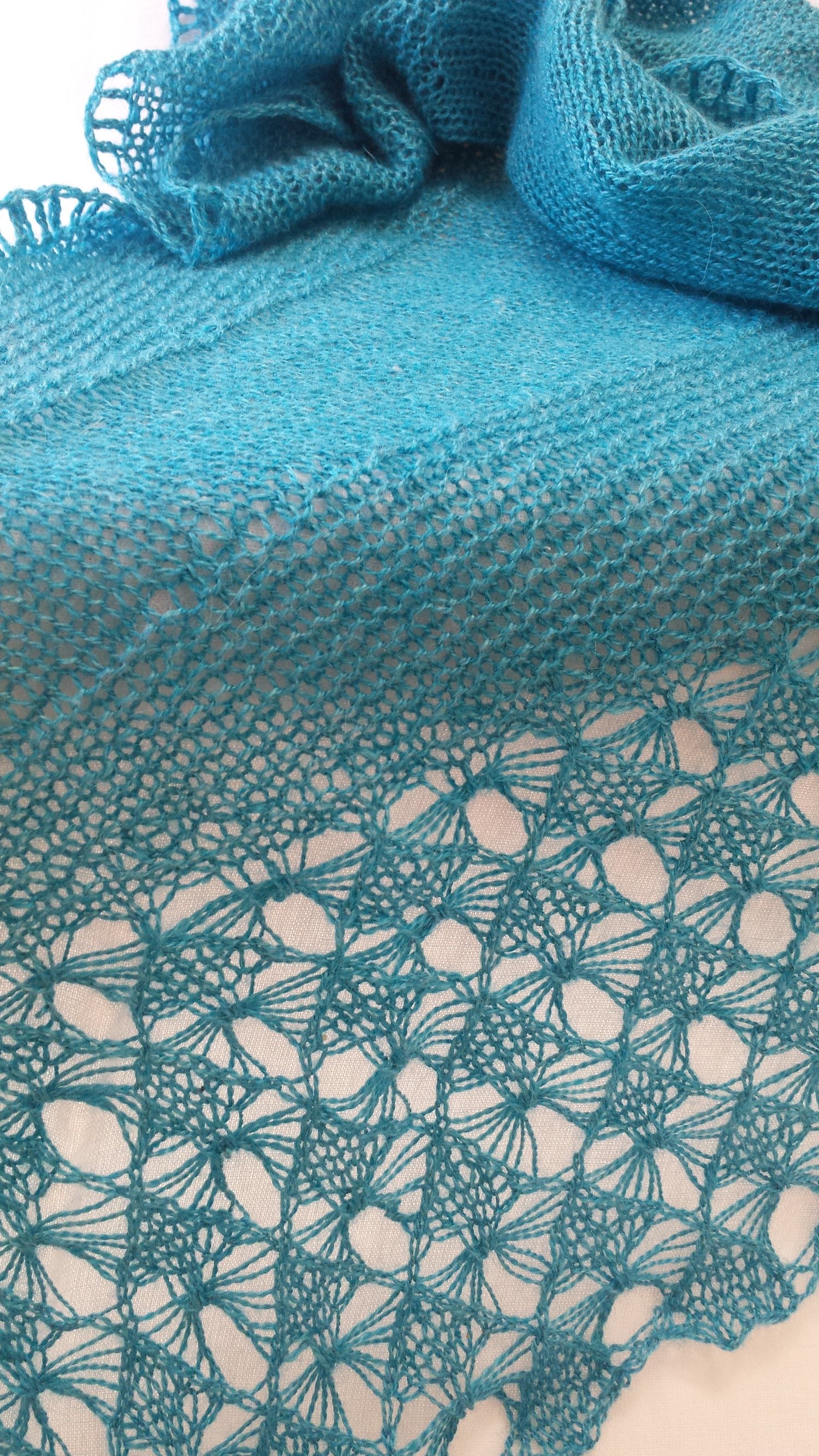 Prisma is an oval-shaped shawl with a lace border and a body worked in alternating garter and stocking stitch, short-row sections. The combination knit in a light (lace or fingering) yarn leaves you with a stunning shawl! It is knit from the bottom upwards.