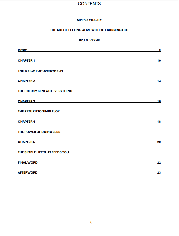 Simple Vitality is a warm, reflective guide to rediscovering your energy through clarity, rhythm, and emotional alignment. In this elegant and powerful book, J.D. Veyne strips away the hype and reminds you: