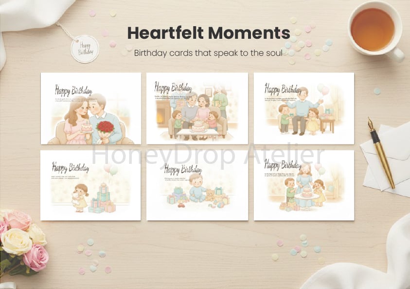 اجلب الدفء والأناقة إلى كل مناسبة مع بطاقات المعايدة HoneyDrop - مجموعة من 6 تصميمات قابلة للطباعة مصممة للاحتفال بالحب والعائلة واللحظات القلبية.