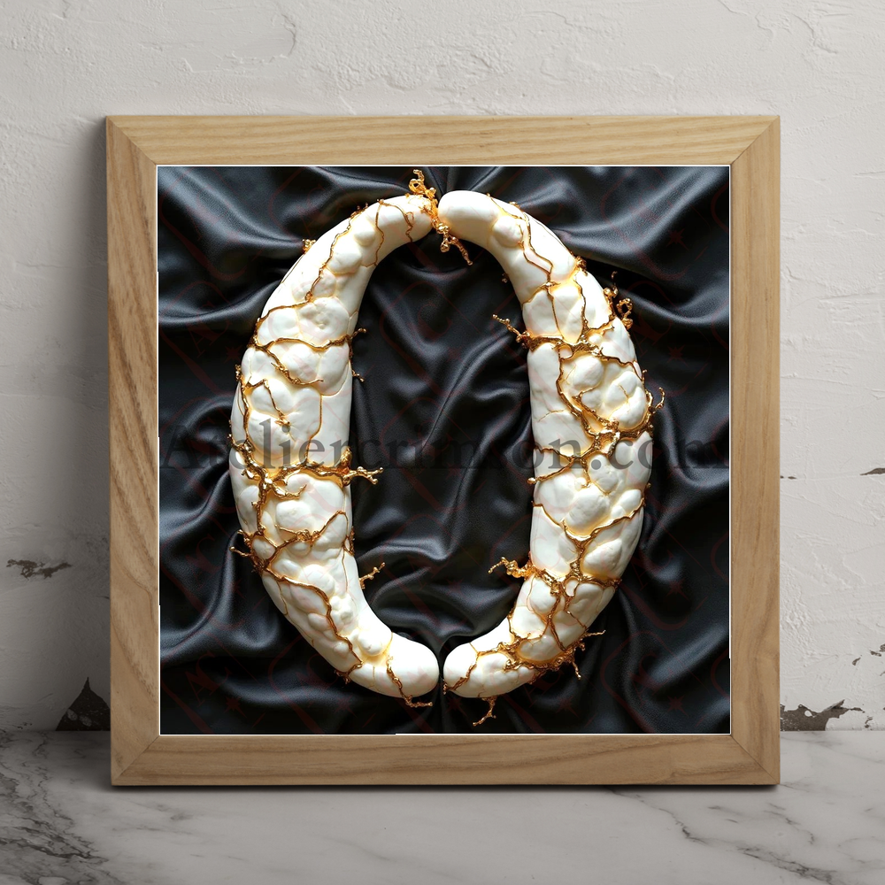 Number 0 Bones with gold fissures A hauntingly beautiful character crafted from pristine human femur bones, intricately arranged to form a bold, serif typeface. Delicate golden fissures, reminiscent of kintsugi art, weave through the ivory-white osseous structure, adding an element of elegant repair. The character stands proudly on a luxurious marbled floor, its form casting subtle shadows. Behind it, a textured black linen backdrop provides a striking contrast, emphasizing the letter's ethereal beauty.