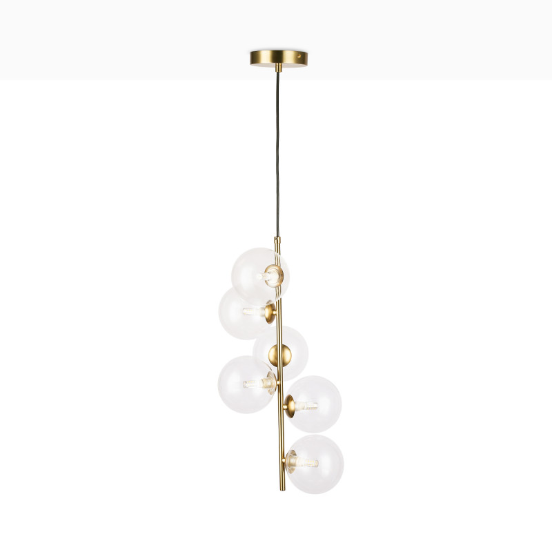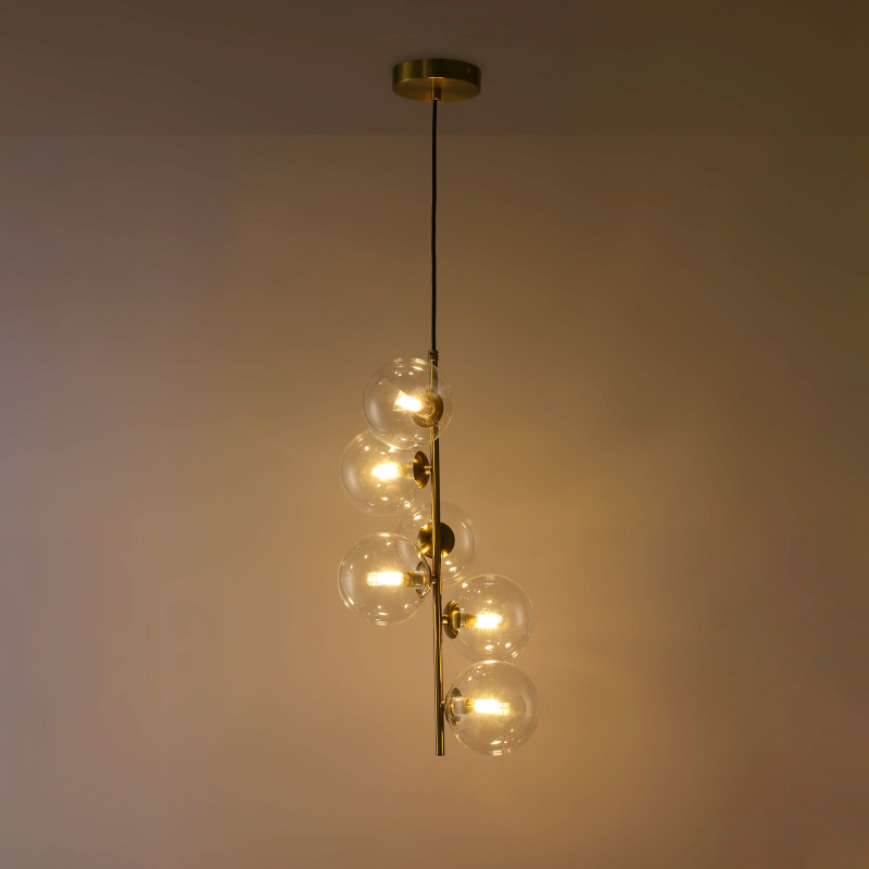 The “ROMEE” suspended lamp is a unique and sophisticated piece, designed to transform any space into a distinctive environment full of personality. Its elegant design combines 6 transparent glass spheres with a golden central structure, creating a versatile aesthetic that adapts to different decorative styles, from classic to contemporary.