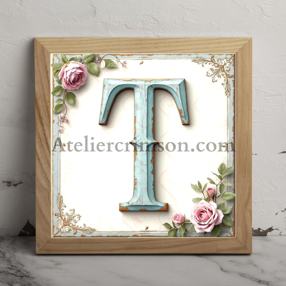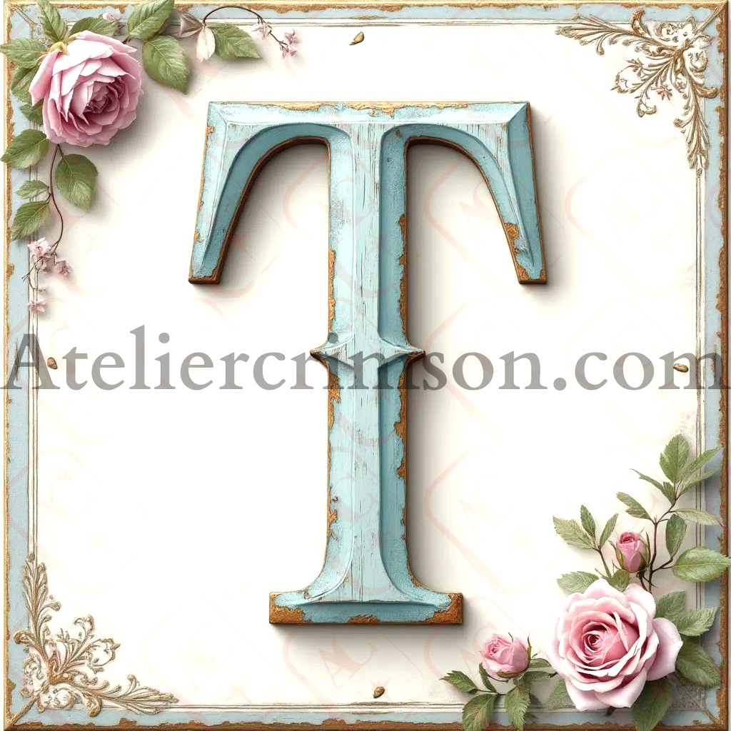 The letter T shabby chic blue a work of art in soft pastel blue. These elegant characters, reminiscent of weathered painted wood, stand out against a delicate off-white background with subtle floral accents. Perfect for vintage-inspired home decor, DIY projects, or creating unique, personalized gifts with a touch of timeless elegance.