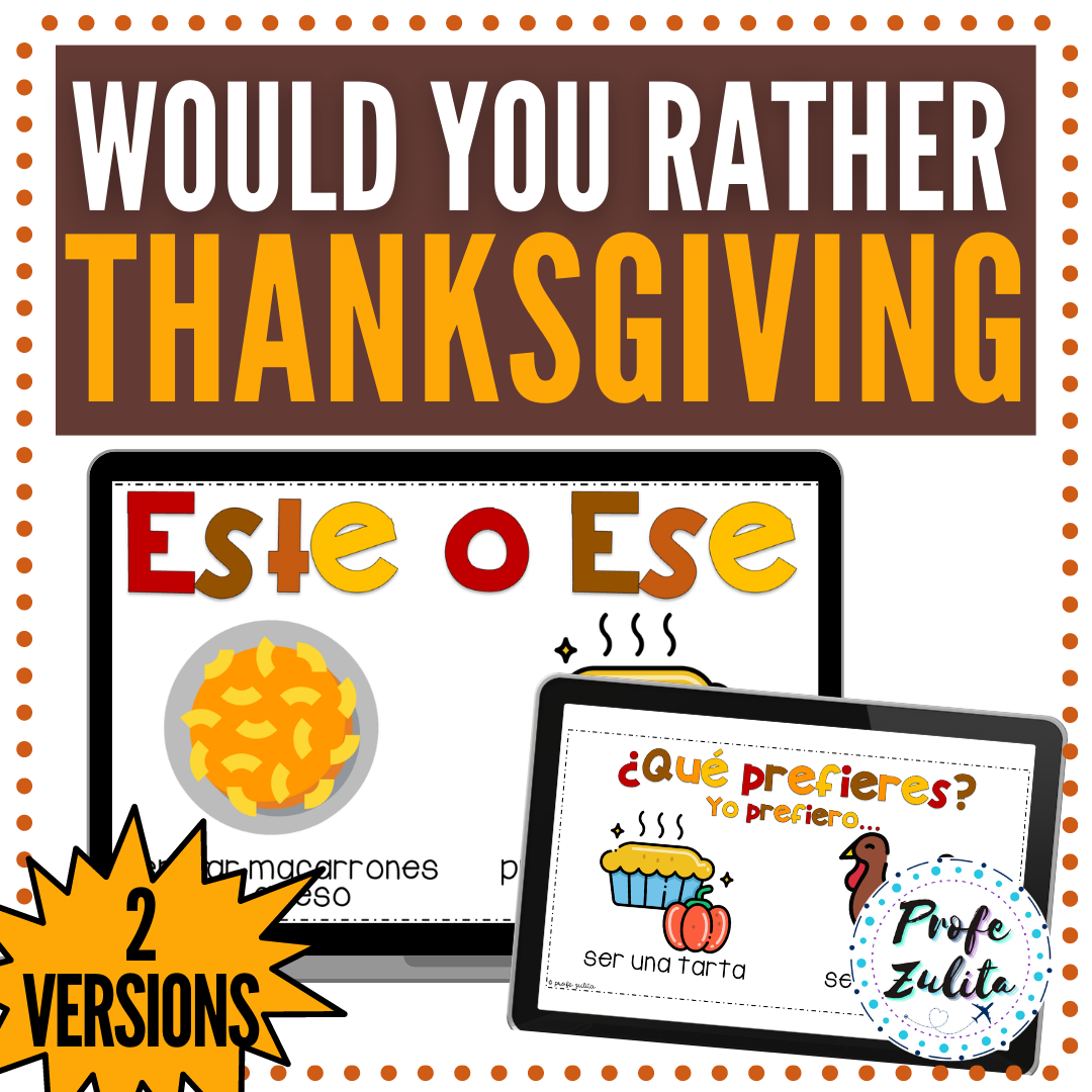 Do you need a no-prep Thanksgiving / Acción de Gracias activity for Spanish class? This Spanish "would you rather...?" or "This or that" game is Thanksgiving / Día de Acción de Gracias themed and perfect for those last days before Thanksgiving break!