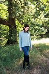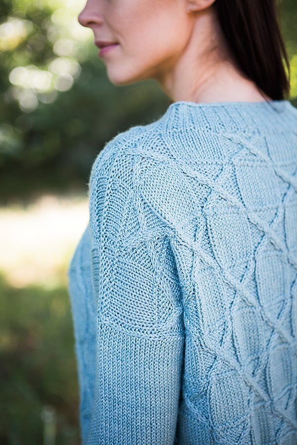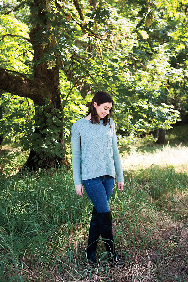 The pullover is worked in pieces from the bottom up, with seams lending structure and an exposed three-needle bind-off providing the final touch at the shoulders.