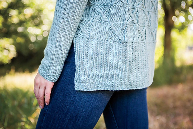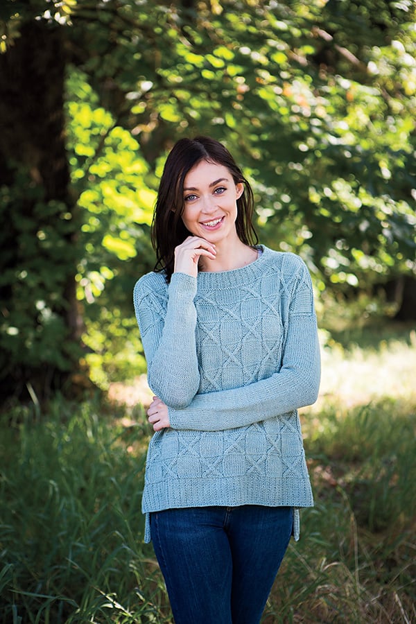 Working this cabled checkerboard fabric in luxurious yarn at a loose gauge is a winning strategy, conveying relaxed elegance in a sweater you’ll love to wear. The dropped-shoulder silhouette with a lower-in-back split hem is both flattering and comfortable, the contemporary look completed with an oversized fit, narrow sleeves and a wide neckline.